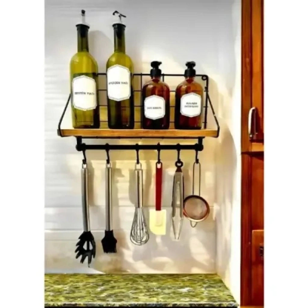 Metal Askılıklı Kahve Köşesi Rafı Metal askılıklı kahve köşesi rafı, mutfağınızda düzeni ve şıklığı bir arada sunar. Üst kısmı ahşap raf, alt kısmı ise metal boru üzerine yerleştirilmiş 6 adet sağlam askılıktan oluşur. Duvara monte edilebilen bu dekoratif düzenleyici, kahve fincanlarınızı, küçük tabakları, kavanozları ve mutfak aksesuarlarını estetik bir biçimde sergilemenize olanak tanır. Mutfak tezgâh üstü alanlarda veya kahve köşelerinde fonksiyonel ve modern bir görünüm yaratır. Metal iskeleti sayesinde uzun ömürlü kullanım sağlar. Az yer kaplayan tasarımı ile dar alanlarda bile pratik çözümler sunar.