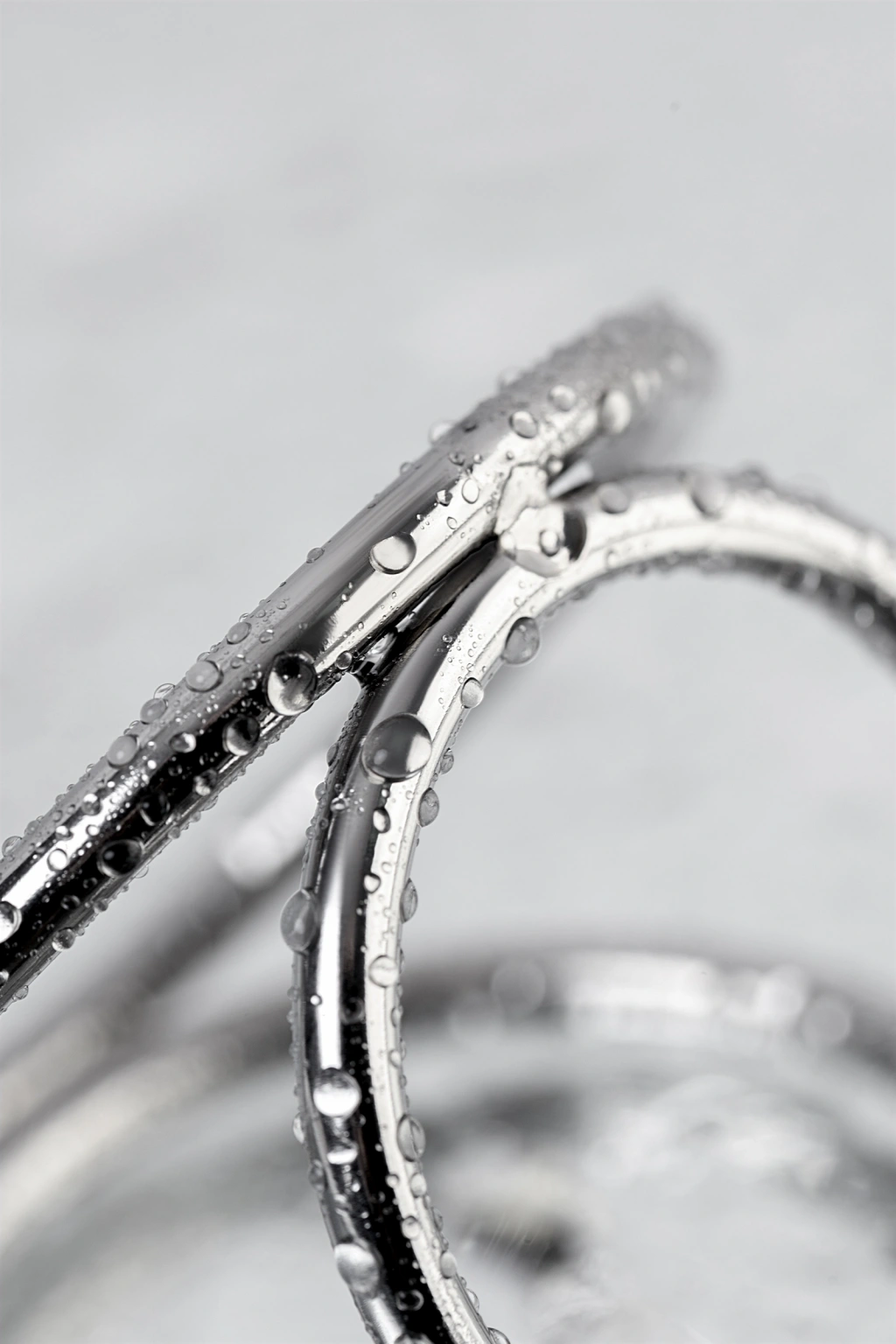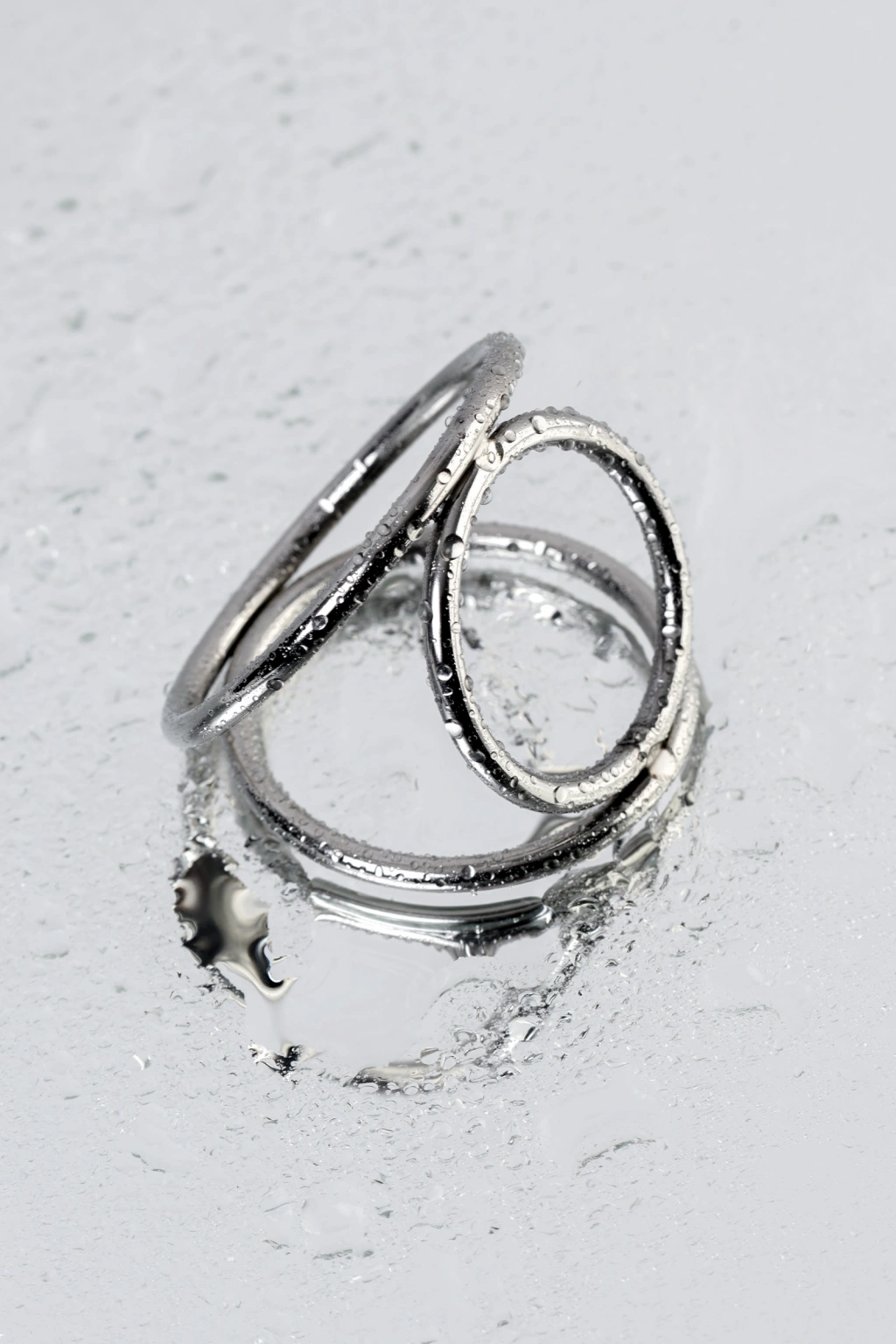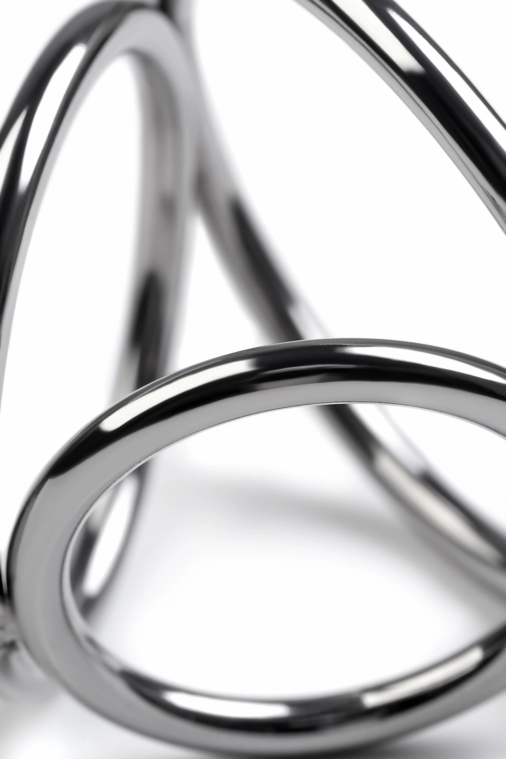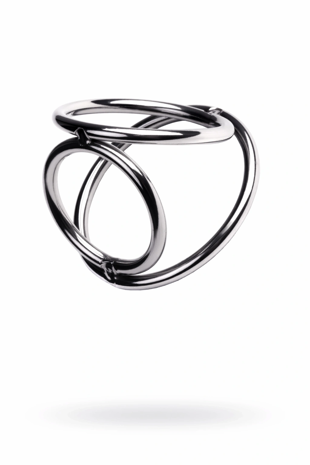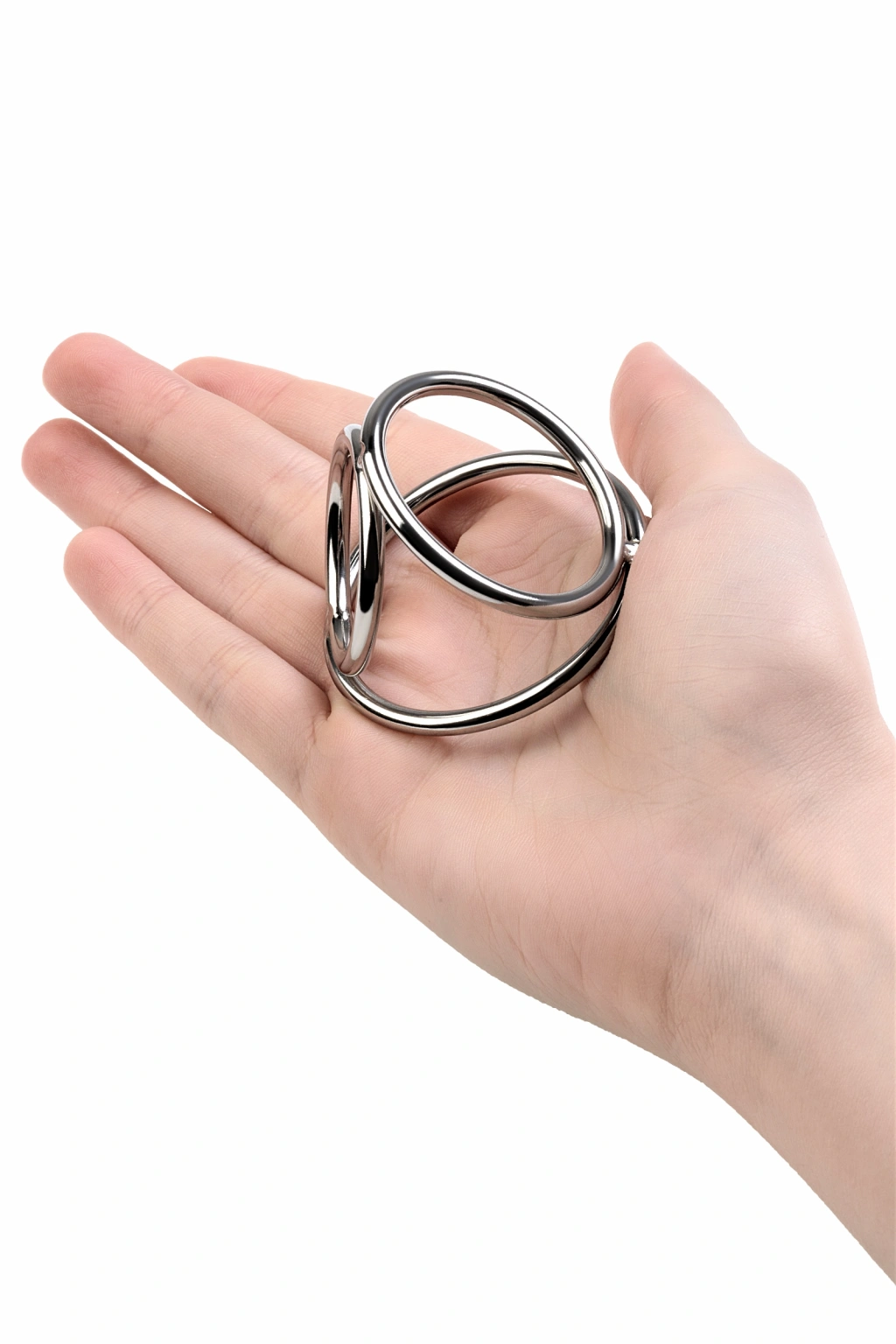 Penis için üçlü esaret. Farklı çaplardaki halkalar penisi ve skrotumu birlikte, testisleri ve penis gövdesinin tabanını ayrı ayrı sabitler. Halkaların çapları 35mm / 45mm / 50mm'dir.