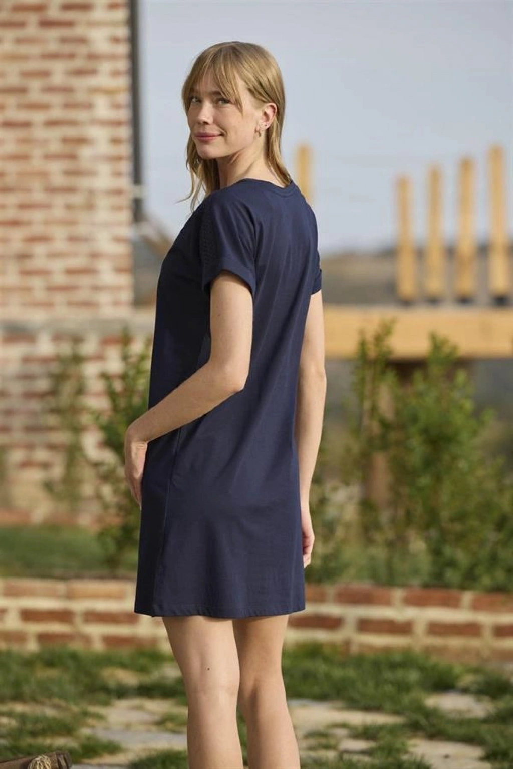 Gecelik: Lacivert renklidir, bisiklet yakalıdır, kısa kolludur, meyve ve yaprak baskılıdır, "Feel Good" yazılıdır, omzu dantellidir, örme kumaştır.