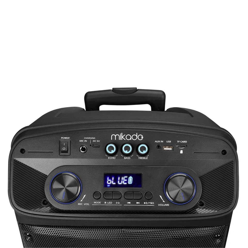 MarkaMikadoModelMD-BT505AçıklamaKablosuz Taşınabilir SpeakerRenkSiyah - MaviAydınlatmaRGBHoparlör Ünitesi1x 12 inç + 2x 2 inç SpeakerÇıkış Gücü60WPil7.4V/3600MAHPortsMic + DC 5V Type-C + Aux + USB + SD KartTWS İşleviEvetTaşıma KoluEvetTiz AyarlarıEvetBas AyarlarıEvetYankı AyarlarıEvetÜrün Boyutu348x310x560 mmAksesuarlarÜrün + Adaptör + Uzaktan Kumanda + El Tipi Mikrofon + Kulaklık Mikrofon + Kullanım Kılavuzu / Garanti BelgesiGaranti Süresinin24 ay