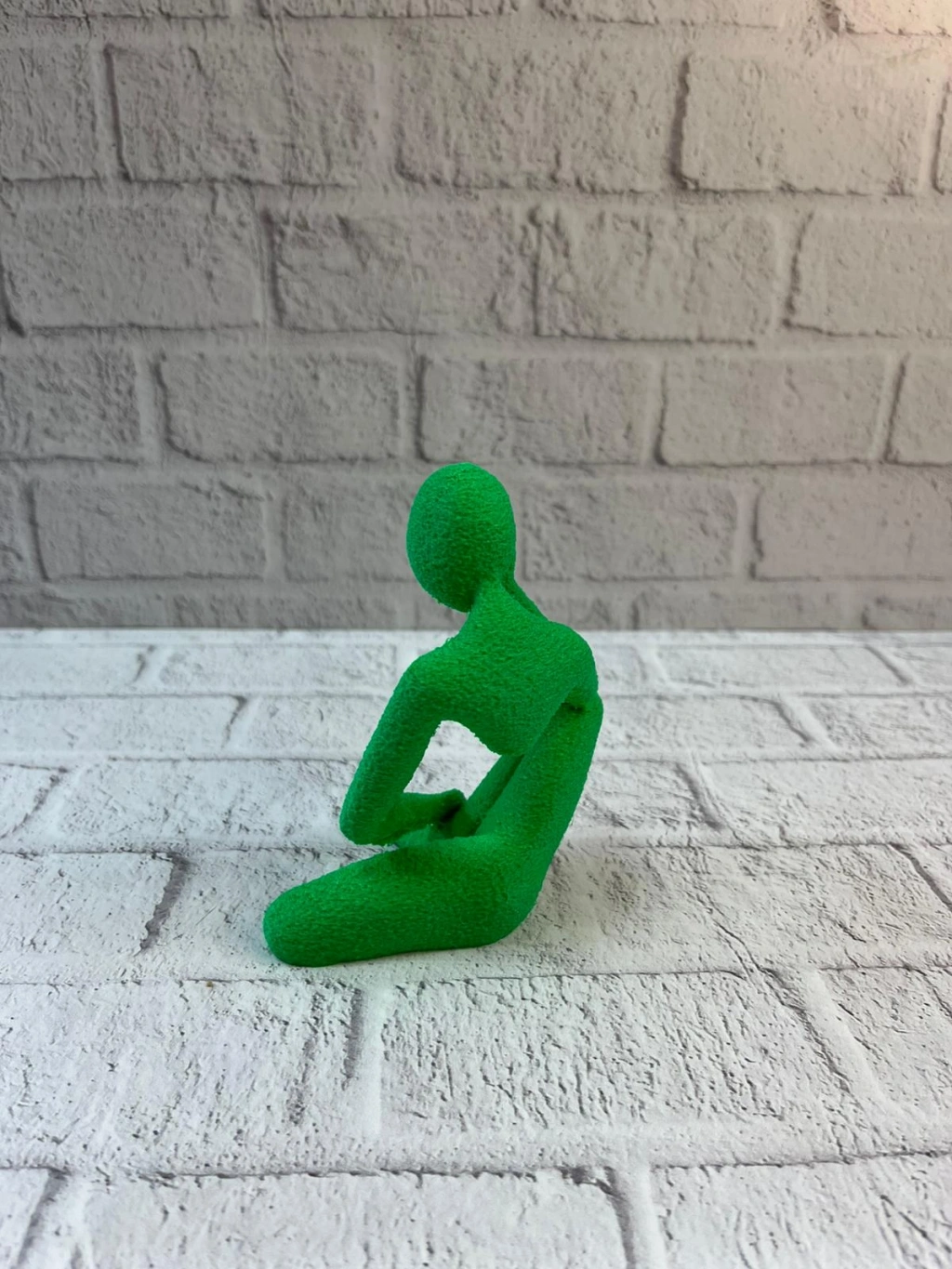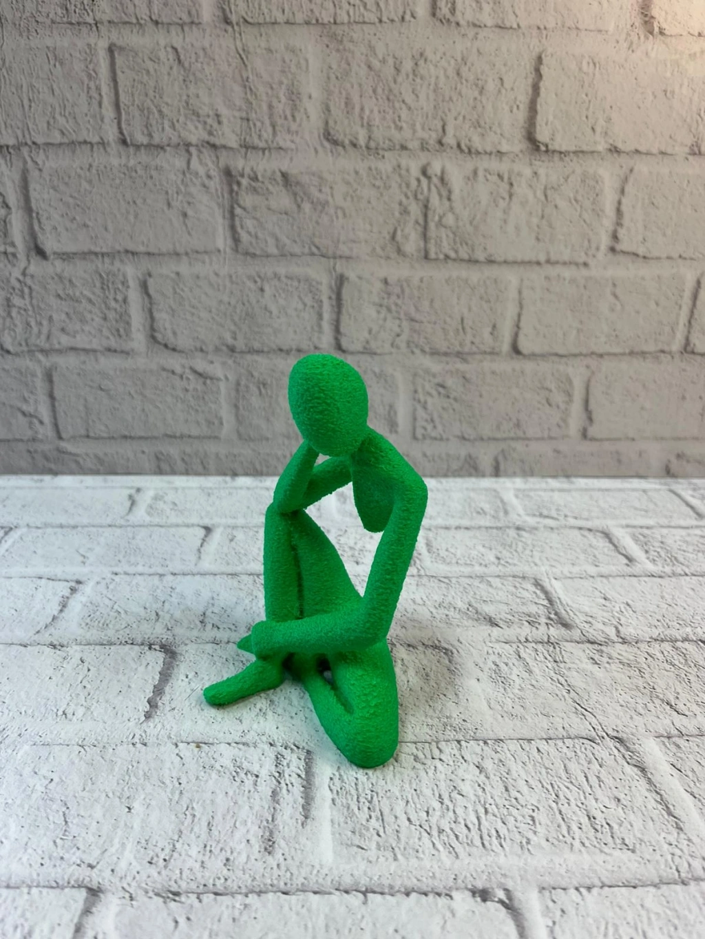 Yeşil insan figürü biblo, düşünceli pozuyla dekorasyona karakter katar. Küçük boyutları sayesinde dar alanlarda bile şık bir tamamlayıcı olarak kullanılabilir. Evde, ofiste veya çalışma alanlarında masa üstü ya da raf dekoru olarak tercih edilebilir. Minimal tasarımı, loş ya da aydınlık ortamlarda estetik bir duruş sergiler ve dekorasyona modern bir hava kazandırır.