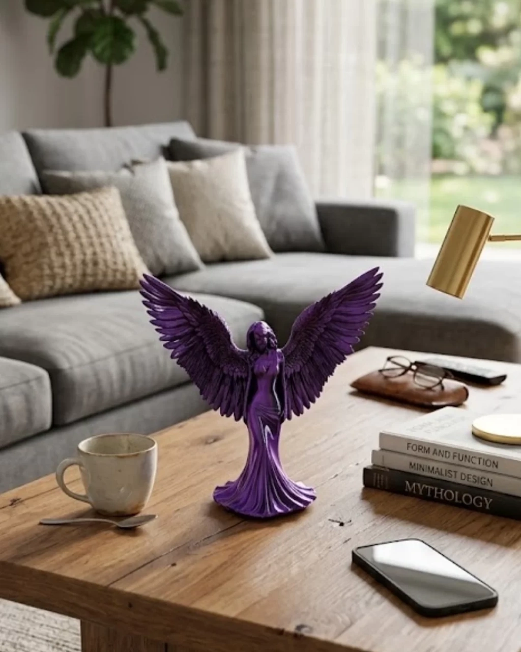 Zarif tasarımı ve etkileyici görünümüyle öne çıkan mor melek biblo, yaşam alanlarınıza estetik ve anlam yüklü bir dokunuş katmak için tasarlanmıştır. Kanatlarını açmış melek figürü, hem huzuru hem de koruyucu bir enerjiyi simgelerken, mor tonları ile gizemli ve sofistike bir atmosfer oluşturur. Küçük boyutlu yapısı sayesinde her alanda rahatlıkla kullanılabilir ve bulunduğu ortamda şık bir detay olarak dikkat çeker.Ürünün kompakt yapısı, onu masa üstü dekorasyonu için ideal hale getirir. Çalışma masası, kitaplık, TV ünitesi, komodin ya da raf üzerinde kolaylıkla konumlandırılabilir. El boyutuna yakın ölçüleri sayesinde fazla yer kaplamaz ancak güçlü tasarımı sayesinde bulunduğu alanda odak noktası olmayı başarır.Parlak ve detaylı yüzey yapısı, ışığı yansıtarak farklı açılardan farklı görünümler sunar. Gün ışığında daha canlı ve enerjik bir görünüm sağlarken, loş ışıkta daha dramatik ve mistik bir hava yaratır. Bu özelliği sayesinde hem gündüz hem gece dekorasyonunda etkileyici bir tamamlayıcıdır.Sadece dekoratif amaçlı değil, aynı zamanda anlamlı bir hediye alternatifi olarak da tercih edilebilir. Sevdiklerinize özel günlerde farklı ve anlamlı bir hediye sunmak isteyenler için ideal bir seçenektir.
