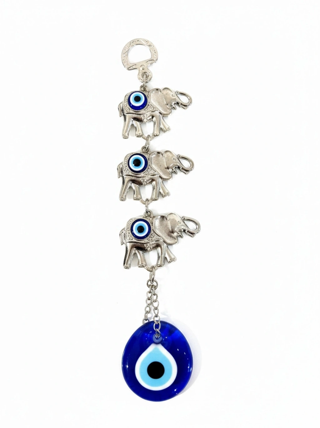 Nazar Boncuğu 3’lü Fil Askılık, üç adet fil figürü ve büyük nazar boncuğunun bir araya geldiği dekoratif bir tasarımdır. Fil figürü kültürel olarak şans, güç, dayanıklılık ve bereketi temsil ederken, nazar boncuğu ise kötü enerjilere karşı koruyucu bir sembol olarak bilinir. Bu iki anlamlı motifin birleşimi yaşam alanlarına hem estetik hem de sembolik değer kazandırır. Metal malzemesi sayesinde dayanıklı ve uzun süre kullanıma uygundur. Kapı girişine, duvarlara, araç içine veya ofis masasına asarak dekoratif bir görünüm elde edebilirsiniz. Üçlü fil tasarımı, bolluğun artması ve bereketin çoğalması anlamını taşır; bu nedenle ev hediyesi, işyeri açılışı veya özel günler için zarif ve anlamlı bir hediye seçeneğidir. Geleneksel mavi nazar boncuğu detayları bulunduğu ortama renk katar ve dikkat çekici bir görünüm sağlar.Paket İçeriği1 Adet Nazar Boncuğu 3’lü Fil Askılık