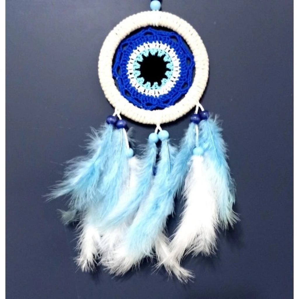 Nazar boncuğu motifli duvar süsümüz bebe mavisi ve beyaz tüyler ile süslenmiştir. Duvar süsümüz el yapımıdır. Ürünümüzün yuvarlak kısmı 12 santimetre çapındadır. Ürünümüz ip ve tüyler dahil 40 santimetre boyundadır.