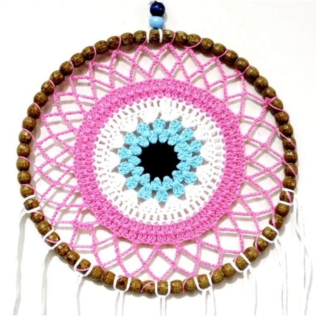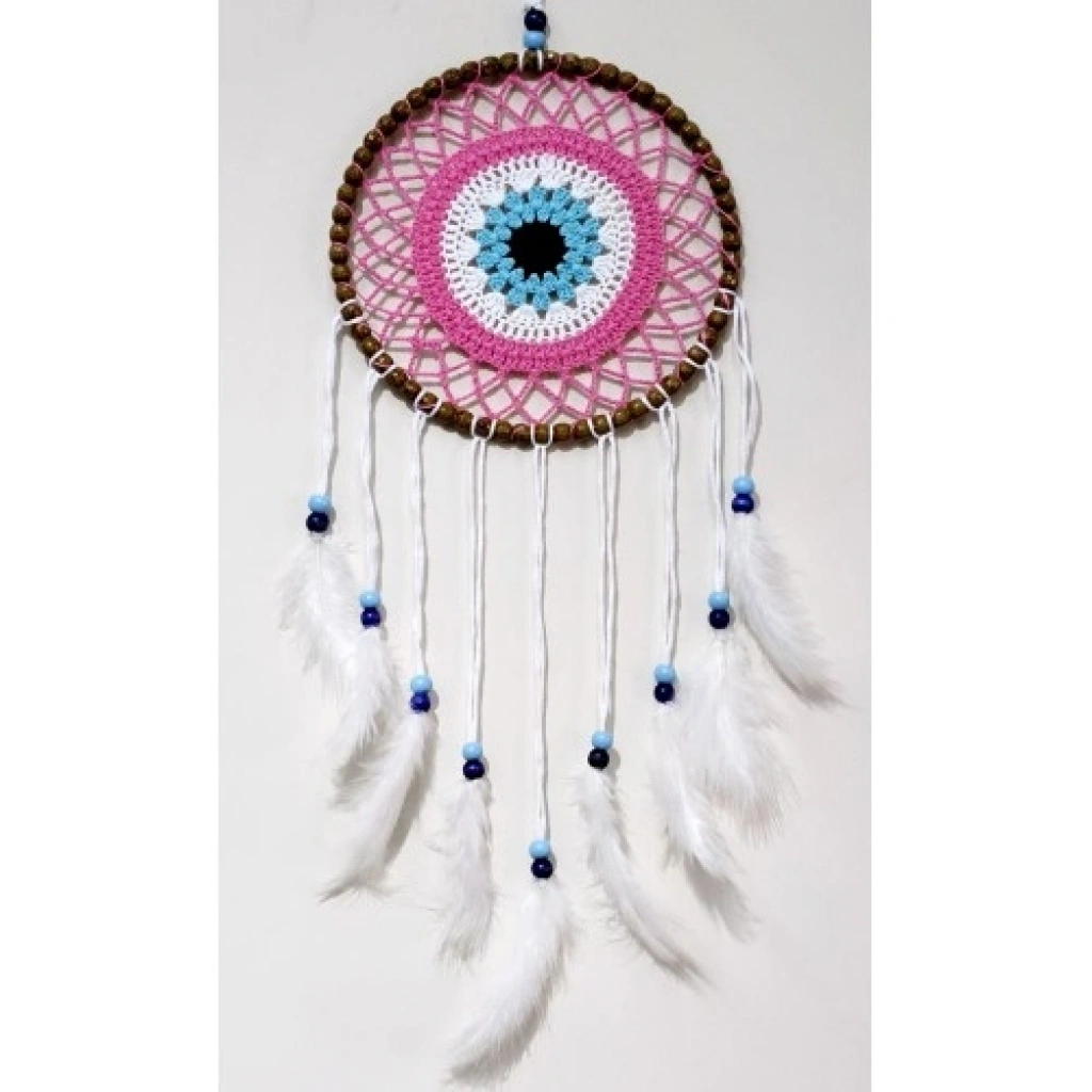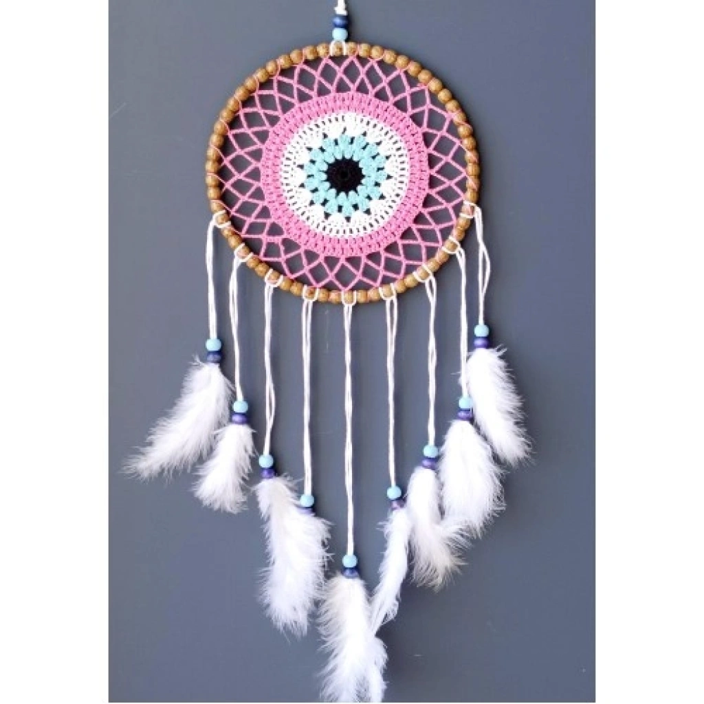 Nazar Boncuğu Motifli Düş Kapanı El Yapımı Pembe Duvar SüsüNazar, koruyucu anlamı ve zarif sembolizmiyle tasarlanan bu el yapımı düş kapanı, pembe tonların yumuşak etkisi ve beyaz kuş tüyleriyle süslenmiş estetik bir duvar dekorudur. Nazar boncuğu motifi, kötü enerjilere karşı koruyucu bir sembol olarak tasarımın merkezinde yer alırken, pembe renk huzur ve romantik bir atmosfer sunar.Ürünümüz tamamen el yapımıdır ve özenle hazırlanmıştır. Yuvarlak ana gövdesi 22 santimetre çapındadır. Sade ve zarif tasarımı, beyaz kuş tüyleriyle tamamlanarak bohem ve şık bir görünüm elde edilmiştir. Düş kapanı formu, olumsuz rüyaları ve enerjileri filtrelediğine inanılan geleneksel bir figürdür.Asma ipi dahil toplam uzunluğu 70 santimetre olan bu duvar süsü, hafif yapısı sayesinde duvara, kapıya veya pencere önüne kolaylıkla asılabilir. Bohem, romantik ve modern dekorasyon tarzlarıyla uyum sağlayarak yaşam alanlarınıza yumuşak ve huzurlu bir dokunuş katar.En özel köşelerinizde dekoratif olarak kullanabileceğiniz bu pembe nazar boncuklu düş kapanı; aynı zamanda yeni ev hediyesi, doğum günü ve özel günler için anlamlı ve zarif bir hediyelik alternatifi sunar.