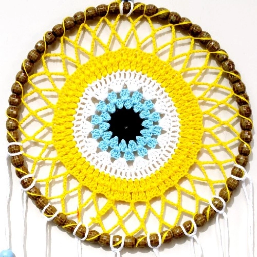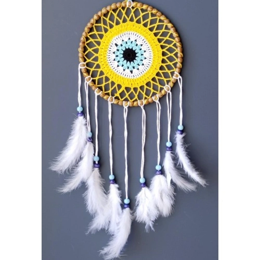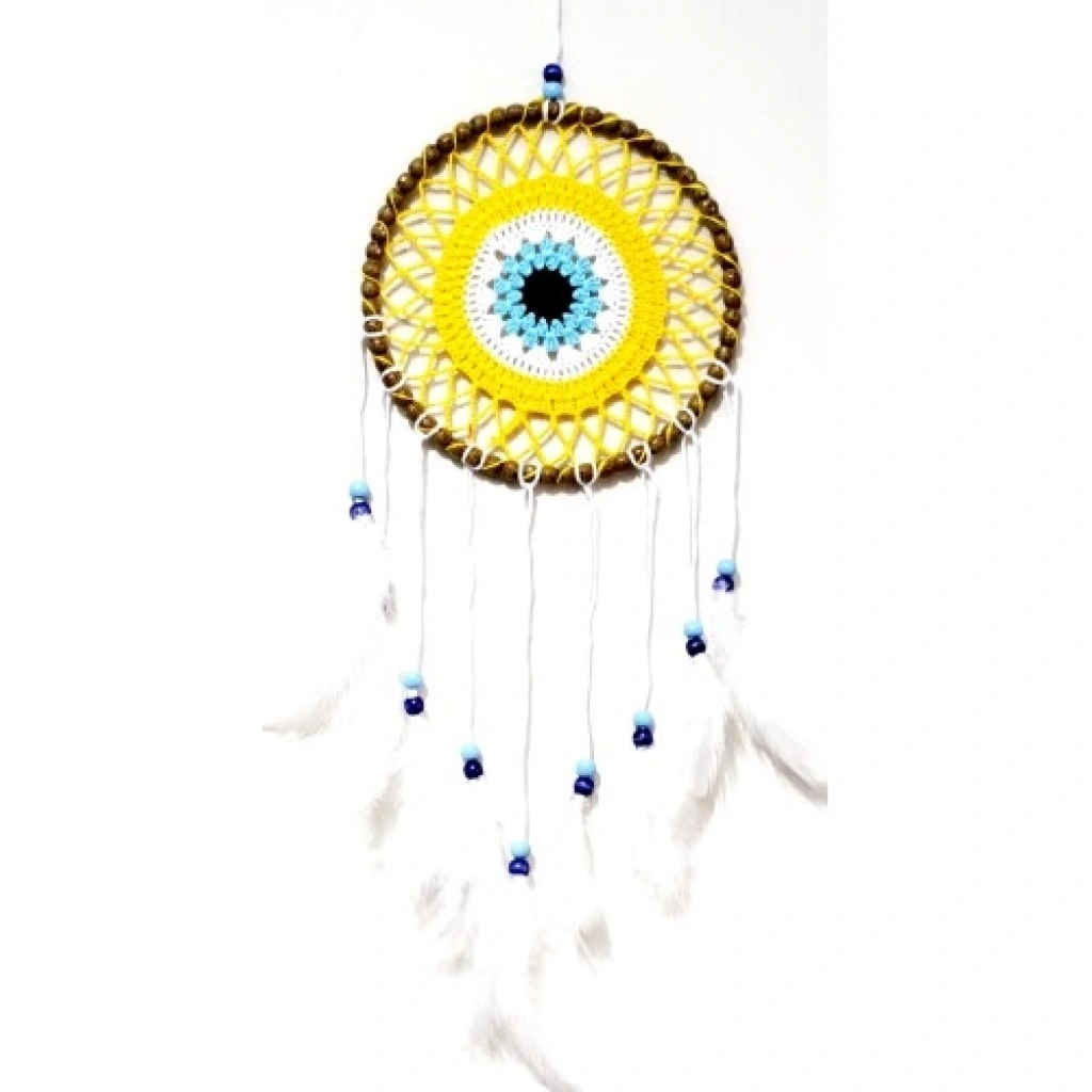 Nazar Boncuğu Motifli Düş Kapanı El Yapımı Sarı Duvar SüsüNazar, pozitif enerjiyi, neşeyi ve canlılığı simgeleyen sarı rengiyle tasarlanan bu nazar boncuğu motifli düş kapanı, hem dekoratif hem de manevi anlamı güçlü özel bir duvar süsüdür. Nazar boncuğu motifi, kötü enerjilere karşı koruyucu bir sembol sunarken sarı tonlar mekâna sıcak ve aydınlık bir atmosfer kazandırır.Ürünümüz tamamen el yapımıdır ve özenle hazırlanmıştır. Yuvarlak ana gövdesi 22 santimetre çapındadır. Beyaz kuş tüyleriyle süslenen tasarım, düş kapanının geleneksel anlamını zarif ve ferah bir estetikle birleştirir. El emeğiyle üretilmiş olması sayesinde her ürün kendine özgü ve benzersizdir.Asma ipi dahil toplam uzunluğu 70 santimetredir. Büyük ve dikkat çekici ölçüsü sayesinde duvarda güçlü bir dekoratif etki oluşturur. Hafif yapısı sayesinde duvara, kapıya veya pencere önüne kolaylıkla asılabilir.Salon, yatak odası, çocuk odası ve bohem dekorasyonlar için ideal olan bu el yapımı düş kapanı; yeni ev hediyesi, doğum günü ve özel günler için anlamlı ve şık bir hediyelik alternatifi sunar. En özel köşelerinizi süslemek veya sevdiklerinize anlamlı bir armağan vermek için tercih edebilirsiniz.