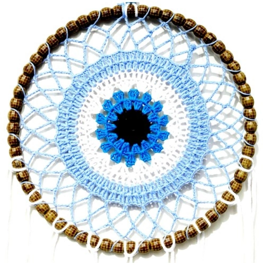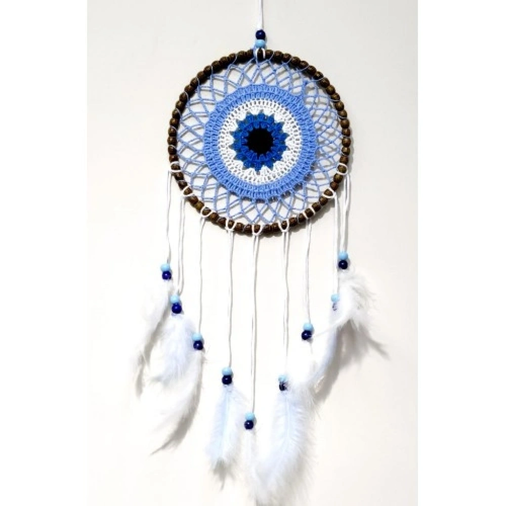 Tamamen el yapımıdır. Nazar boncuğu motifli özel tasarım. Yuvarlak çap: 22 cm Asma ipi dahil toplam uzunluk: 70 cm Beyaz kuş tüyleriyle süslenmiştir. Dekoratif kullanım ve hediye alternatifleri için idealdir.