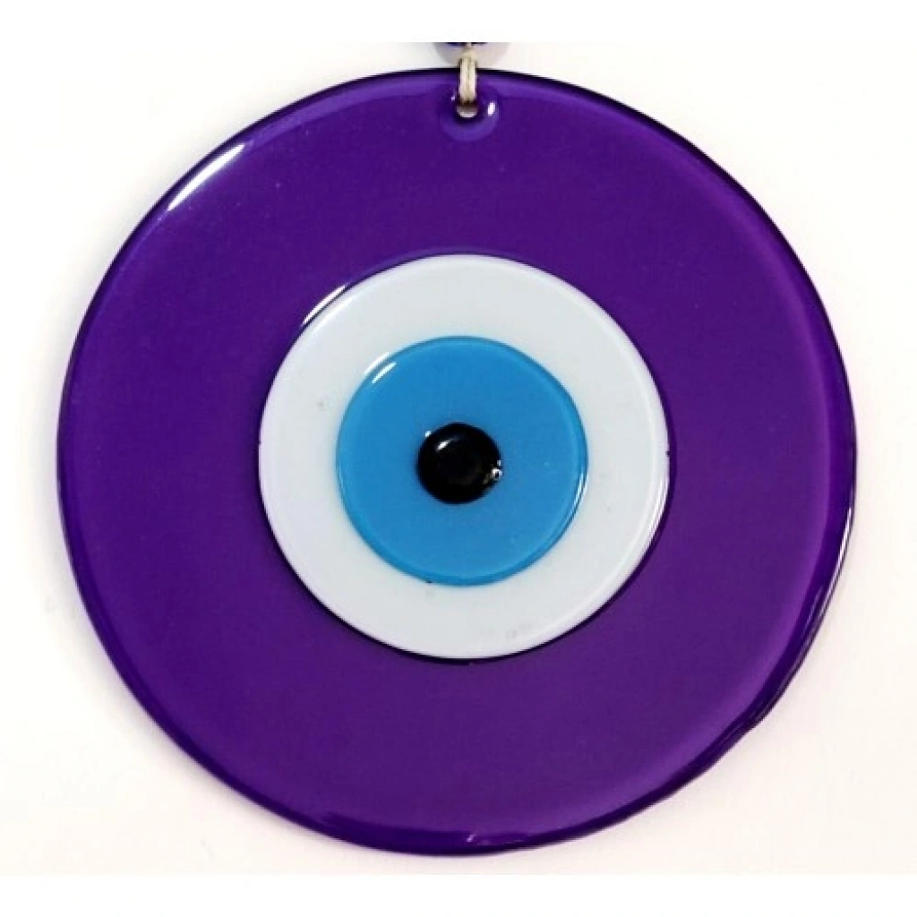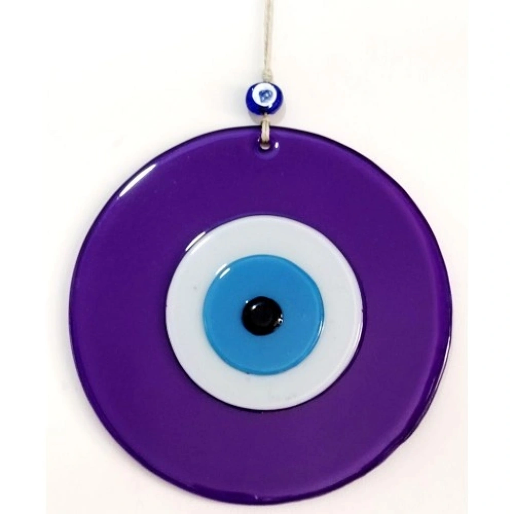 Nazar boncuklu mor renk duvar süsümüz cam malzemeden üretilmiştir. Ürünümüz 20 santimetre çapındadır. Ürünümüz ip dahil 35 santimetre boyundadır.