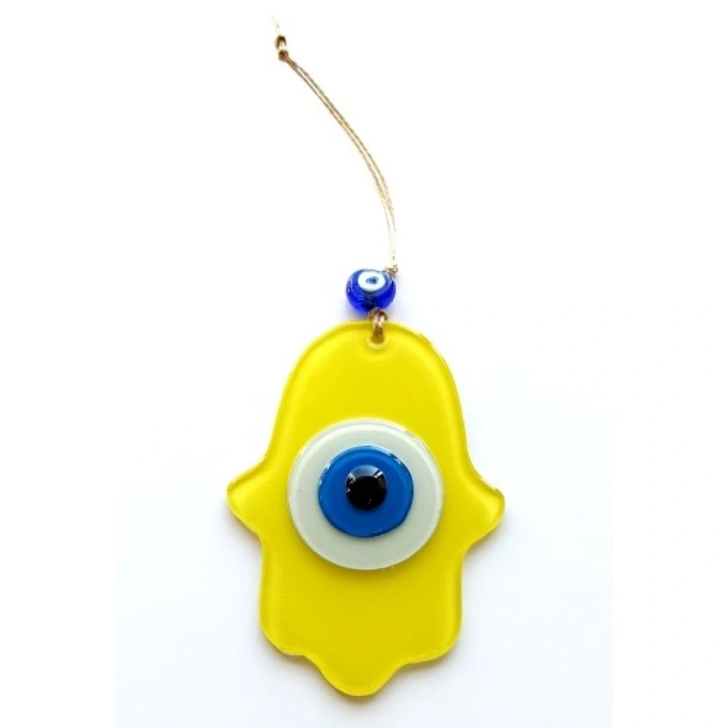 En: 11 cm Boy: 15 cm Toplam Uzunluk (ip dahil): 28 cm Malzeme: Cam Renk: Sarı Tasarım: Nazar boncuklu Fatma Ana Bereket Eli Kullanım Alanı: Duvar süsü, dekor aksesuar, hediye