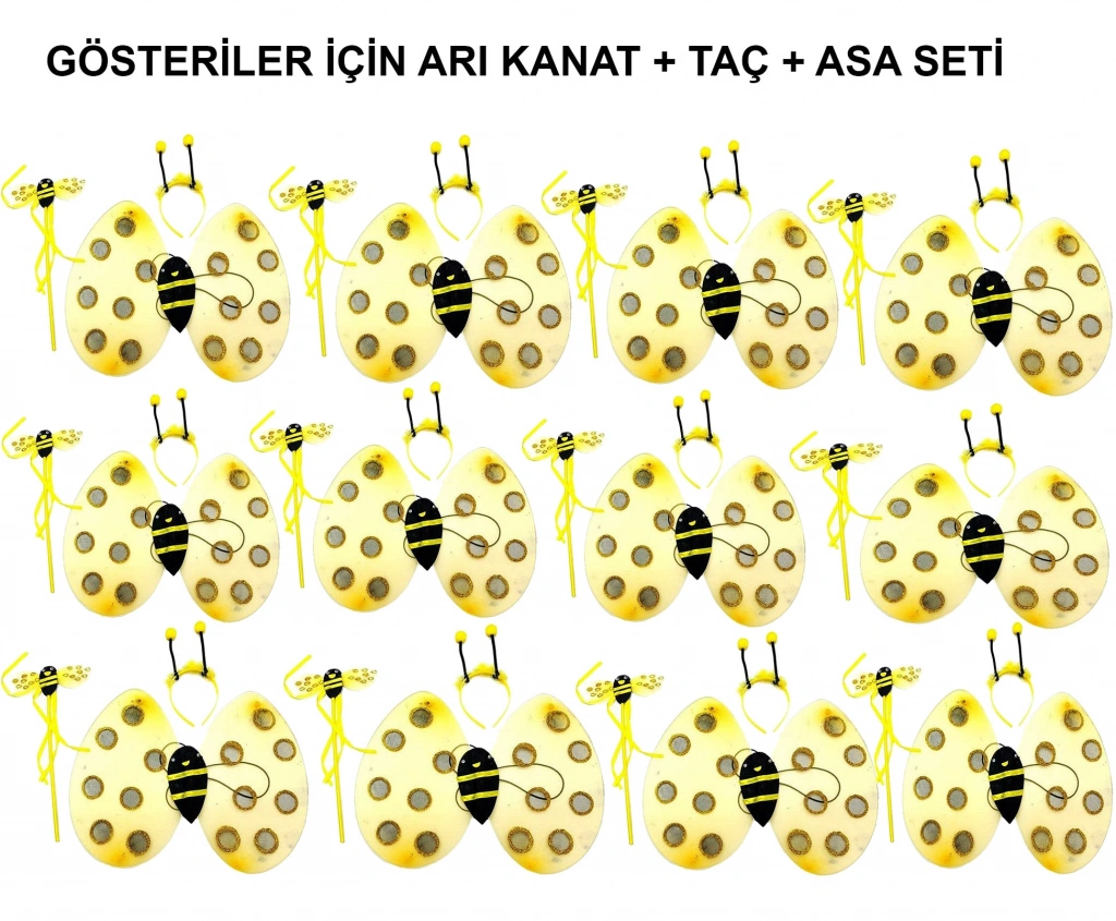 Okul Gösterileri için Arı Seti, 3 parçadan oluşan şık ve eğlenceli bir kostüm setidir ve 12 adetlik paketle sunulur. Set, taç, kanat ve asadan oluşur. Çocukların okul gösterileri, kostüm partileri ve diğer etkinlikler için mükemmel bir seçimdir. Arı temalı tasarımı, çocukların etkinliklerde dikkat çekmesini sağlar. Yumuşak ve hafif kumaşlardan üretilmiş olup, rahat kullanım sağlar. Set, enerjik ve neşeli bir görünüm sunarak etkinliklerin havasını yükseltir. Paket İçeriği12 Adet Arı Kostüm Seti (Her Set: 1 Adet Taç, 1 Adet Kanat, 1 Adet Asa)