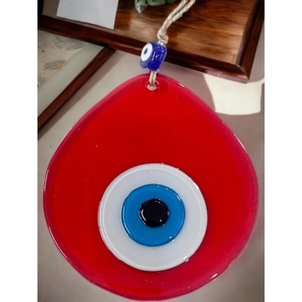 Orta Boy Şeffaf Kırmızı Damla Desen Nazar Boncuklu Duvar Dekoru Orta, enerjiyi ve tutkuyu simgeleyen şeffaf kırmızı tonu ile tasarlanan bu damla desenli nazar boncuklu cam duvar süsü, tamamen el işçiliğiyle üretilmiş estetik ve anlamlı bir dekoratif üründür. Nazar boncuğu figürü, kötü enerjilere karşı koruyucu bir sembol sunarken damla formu tasarıma zarif ve akıcı bir görünüm kazandırır.Şeffaf cam yapısı sayesinde ışığı yumuşak bir şekilde yansıtan bu el yapımı duvar süsü, bulunduğu ortama sıcak ve dikkat çekici bir atmosfer katar. El emeğiyle hazırlanmış olması, her ürünü kendine özgü ve benzersiz kılar.Şeffaf kırmızı damla desenli nazar boncuklu cam duvar süsümüz 10 x 12 santimetre ölçülerindedir. İp dahil toplam uzunluğu 21 santimetredir. Hafif yapısı sayesinde duvara, kapıya, pencere önüne veya dar alanlara kolaylıkla asılabilir. Ev, ofis ve iş yeri dekorasyonları için ideal olan bu cam duvar süsü; yeni ev hediyesi, küçük hediyelikler ve nazar temalı anlamlı armağanlar için şık bir hediyelik alternatifi sunar.