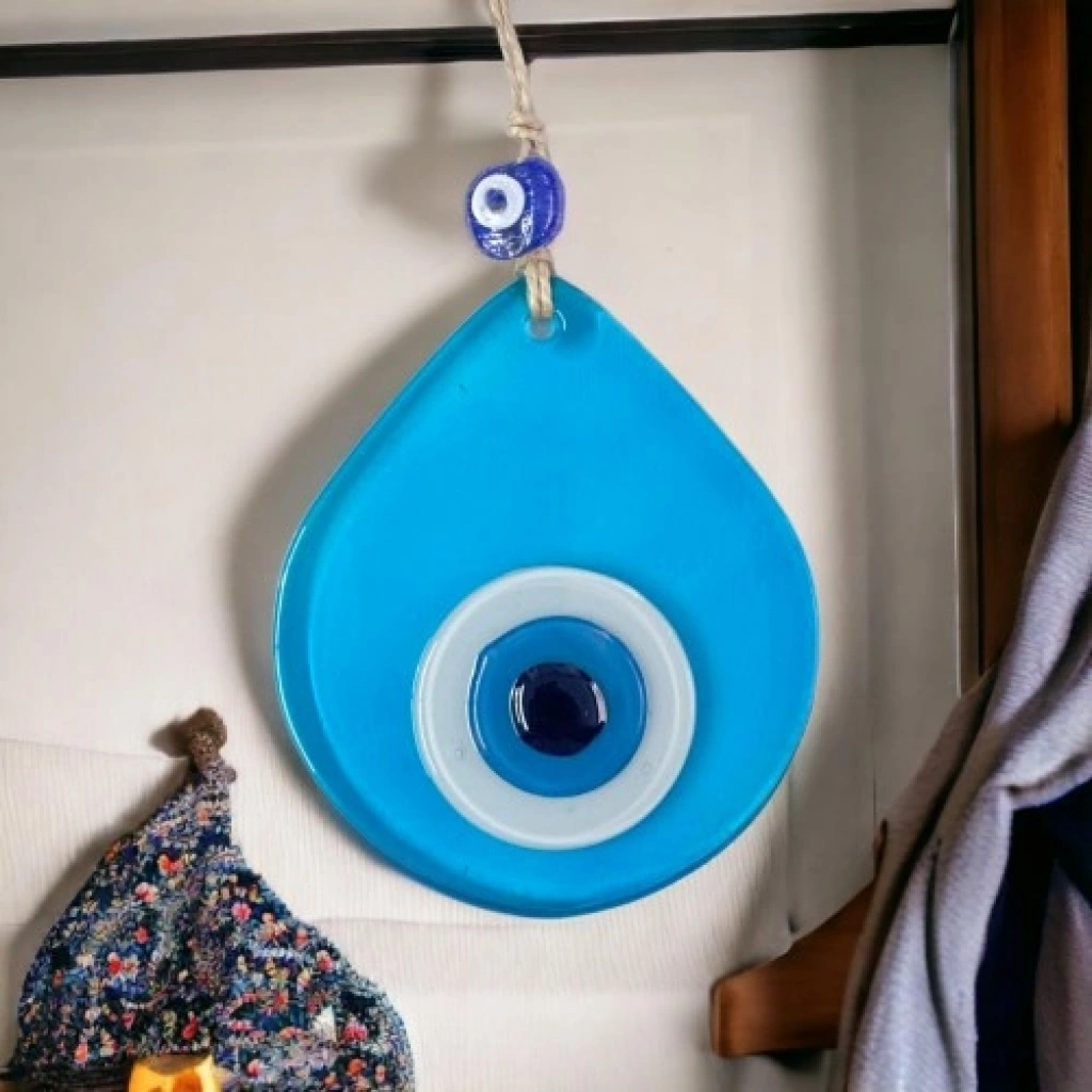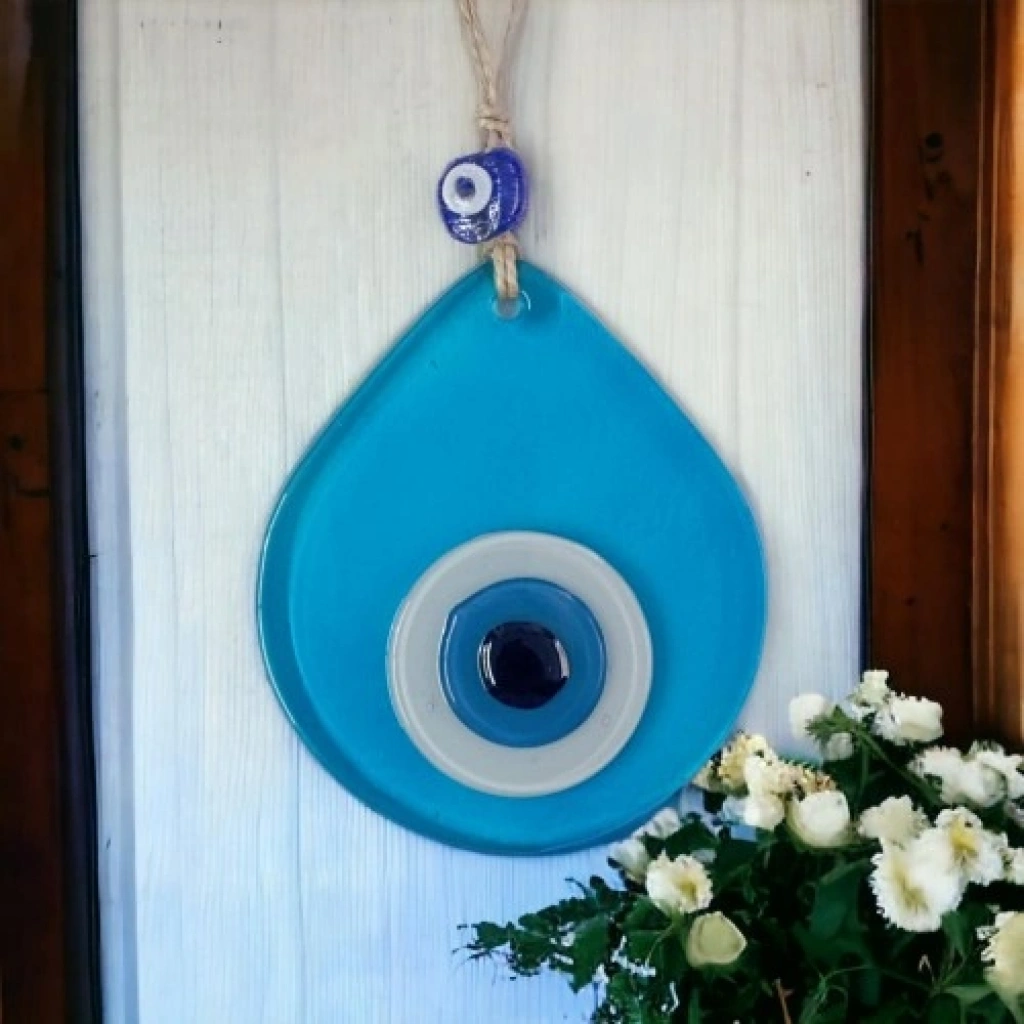 Orta boy şeffaf turkuaz renk nazar boncuklu duvar süsümüz tamamen el işçiliği ile üretilmiştir. Tasarım harikası el yapımı nazar boncuklu duvar süsümüz 10 x 12 santimetre ölçülerindedir. Ürünümüz ip dahil 21 santimetre boyundadır.