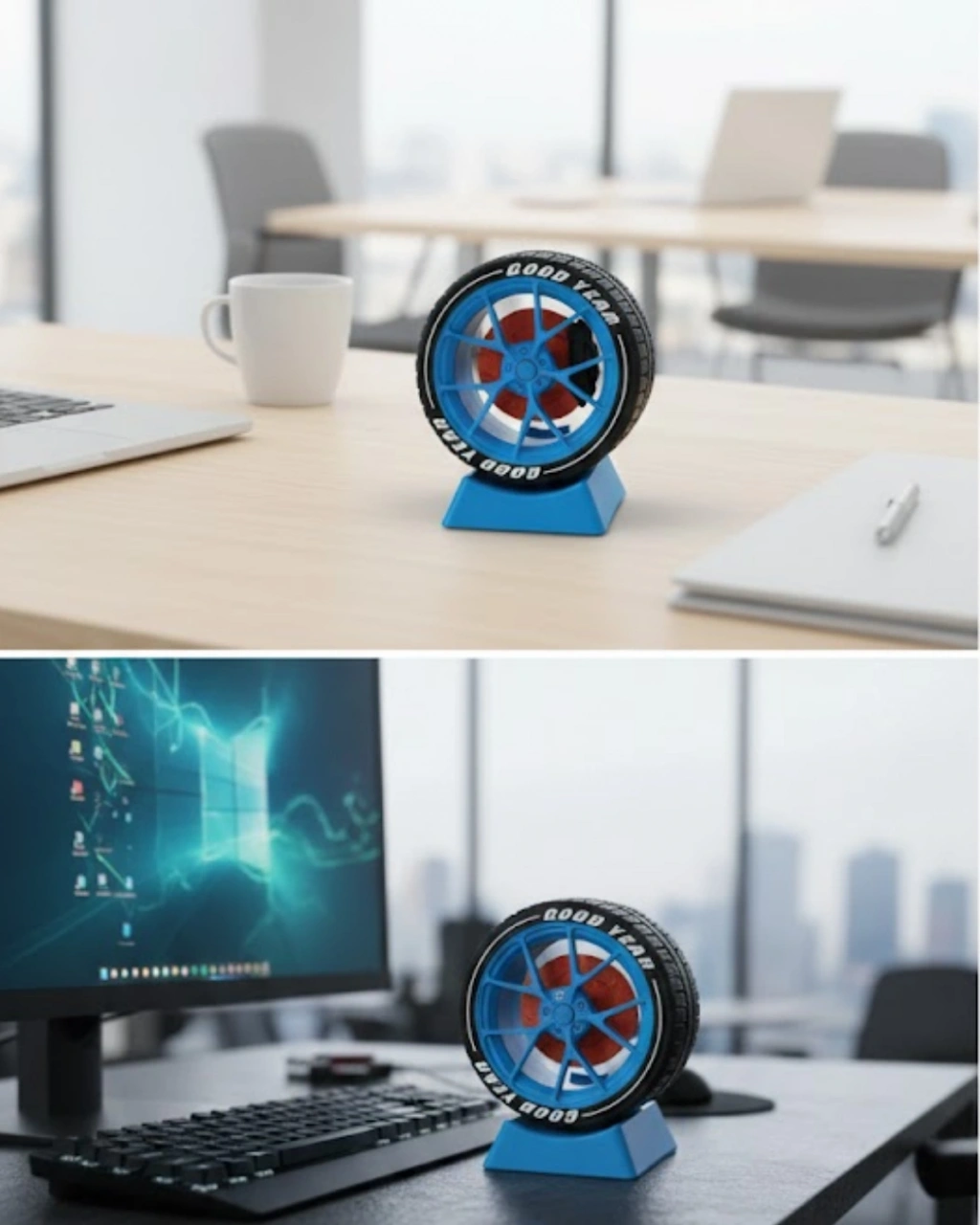 Otomobil jant görünümlü masa üstü dekor, özellikle araba meraklıları için tasarlanmış şık bir ofis aksesuarıdır. Çalışma masasının üzerinde konumlandırıldığında sade ofis düzenine sportif ve dinamik bir hava katar. Dengeli tabanı sayesinde sabit durur ve devrilme yapmaz. Ofis, home office, atölye veya showroom ortamlarında dekoratif amaçla kullanılabilir. Minimal boyutları ile masada düzeni bozmazken görsel olarak güçlü bir etki oluşturur.