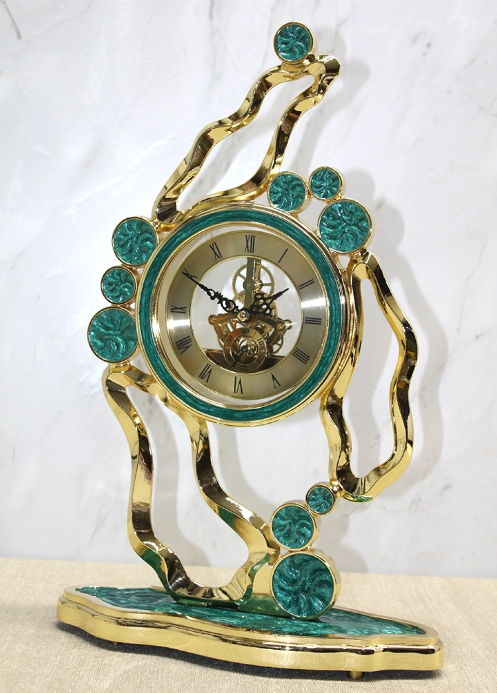Özel yeşim tasarımlı masa üstü saat, zarif görünümüyle dekoratif ve işlevsel bir parça sunar. Altın tonları ile yeşilin uyumunu yansıtan şık tasarımı, hem klasik hem de modern dekorasyonlarla uyum sağlar. 41x27 cm ölçüleri sayesinde masa üstünde dikkat çekici bir obje olurken aynı zamanda zamanı takip etmenizi kolaylaştırır. Kaliteli malzemeden üretilmiş olup uzun süreli kullanım için idealdir. Evinize, ofisinize ya da sevdiklerinize hediye olarak tercih edilebilecek özel bir dekoratif aksesuardır.Paket İçeriği1 adet Özel Yeşim Tasarım Masa Üstü Saat