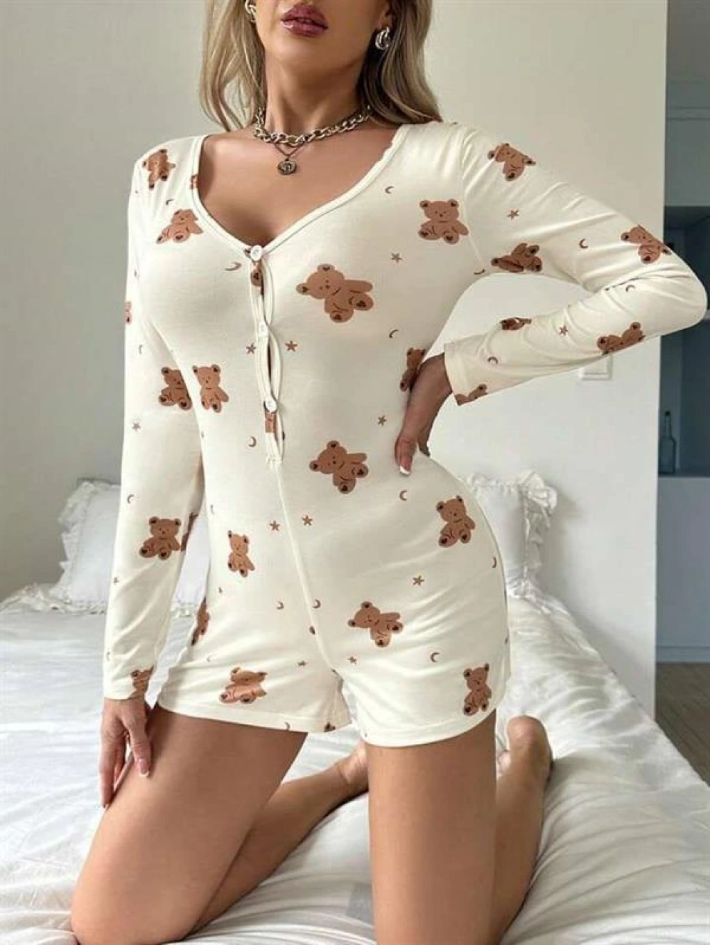 Sevimli ayıcık desenleriyle tasarlanan pamuklu ekru tulum pijama, yumuşak dokusu ve doğal kumaşıyla gün boyu konfor sunar. %100’e yakın pamuklu yapısı sayesinde nefes alabilir özellik gösterir, cilde nazikçe temas eder ve rahat bir uyku deneyimi sağlar.