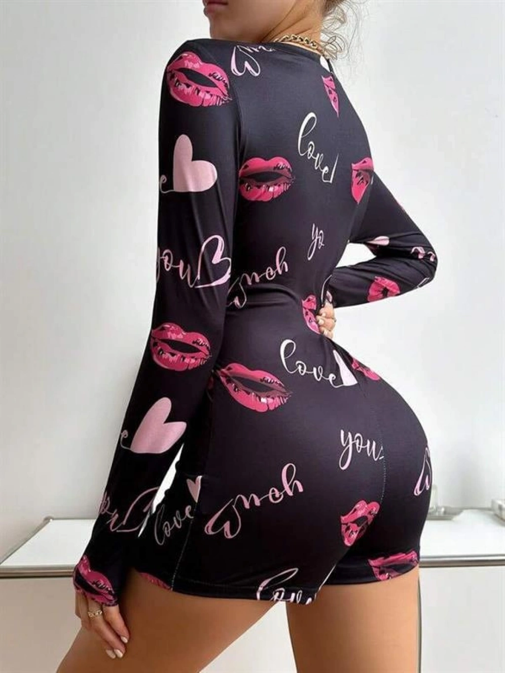 Romantik kalp ve öpücük desenleriyle ev giyimine enerjik bir dokunuş katan bu tulum pijama, yumuşak pamuklu dokusu sayesinde gün boyu konfor sunar. Uzun kollu yapısı serin havalarda sıcak tutarken, tek parça formu rahat ve özgür bir kullanım sağlar.