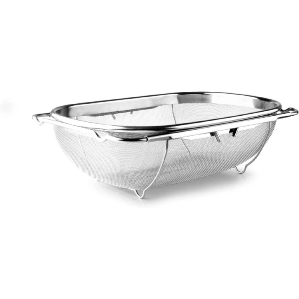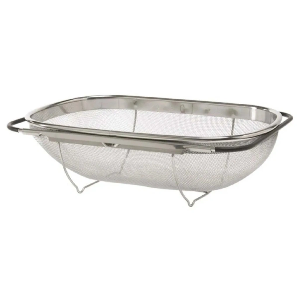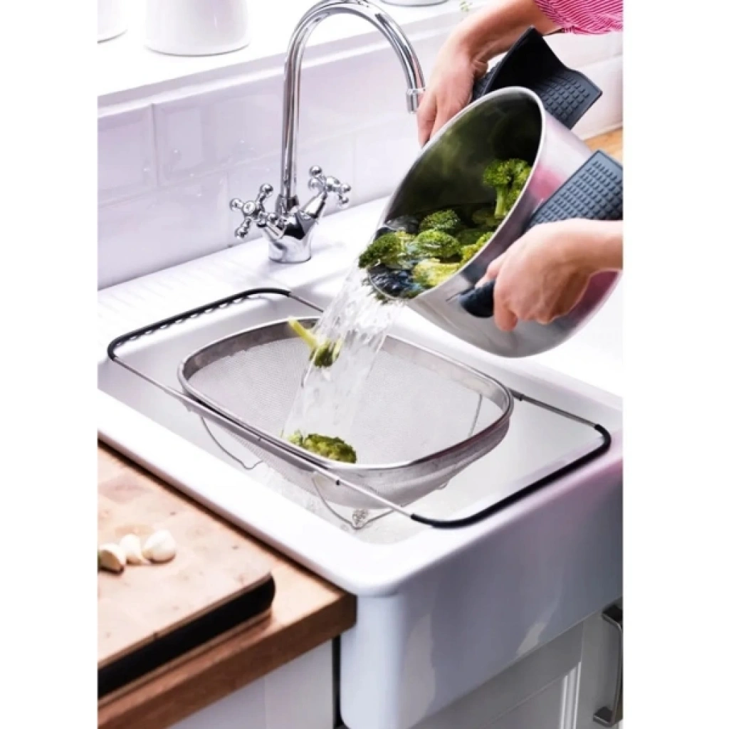 Paslanmaz çelik teleskopik süzgeç, meyve, sebze, makarna gibi yiyecekleri yıkamak veya süzmek için kullanılır. Dayanıklı paslanmaz çelik yapısı uzun ömürlüdür ve etkili süzme sağlar. İnce delikli tel örgü yapısı sayesinde küçük parçaların kaçmasını önler. Teleskopik açılıp kapanabilir yan kolları, süzgecin lavabo üzerine kolayca yerleştirilmesini sağlar ve farklı lavabo genişliklerine uyum gösterir. Süzgeç, katlanabilir ayakları sayesinde yerden yükseltilerek daha hijyenik kullanım sunar. Hem ev tipi mutfaklar hem de profesyonel mutfaklar için uygundur. Paket İçeriği1 Adet Paslanmaz Çelik Teleskopik Süzgeç