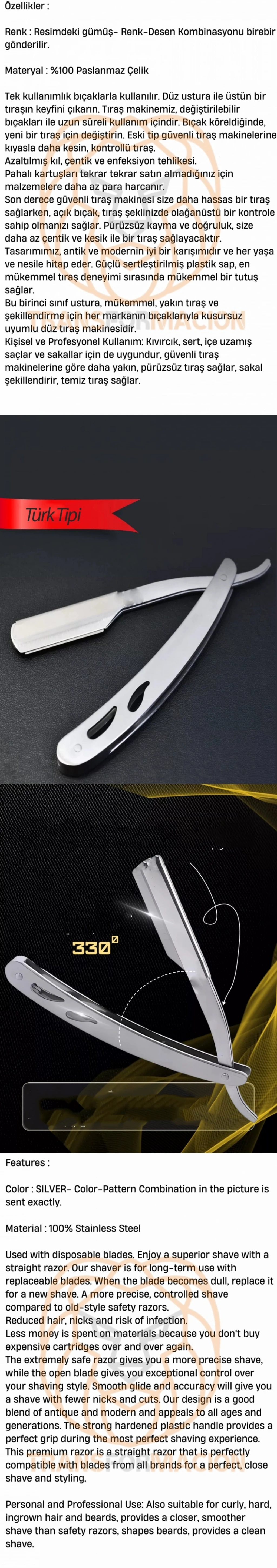 Son derece güvenli tıraş makinesi size daha hassas bir tıraş sağlarken, açık bıçak, tıraş şeklinizde olağanüstü bir kontrole sahip olmanızı sağlar. Pürüzsüz kayma ve doğruluk, size daha az çentik ve kesik ile bir tıraş sağlayacaktır. Tasarımımız, antik ve modernin iyi bir karışımıdır ve her yaşa ve nesile hitap eder. Güçlü sertleştirilmiş plastik sap, en mükemmel tıraş deneyimi sırasında mükemmel bir tutuş sağlar.