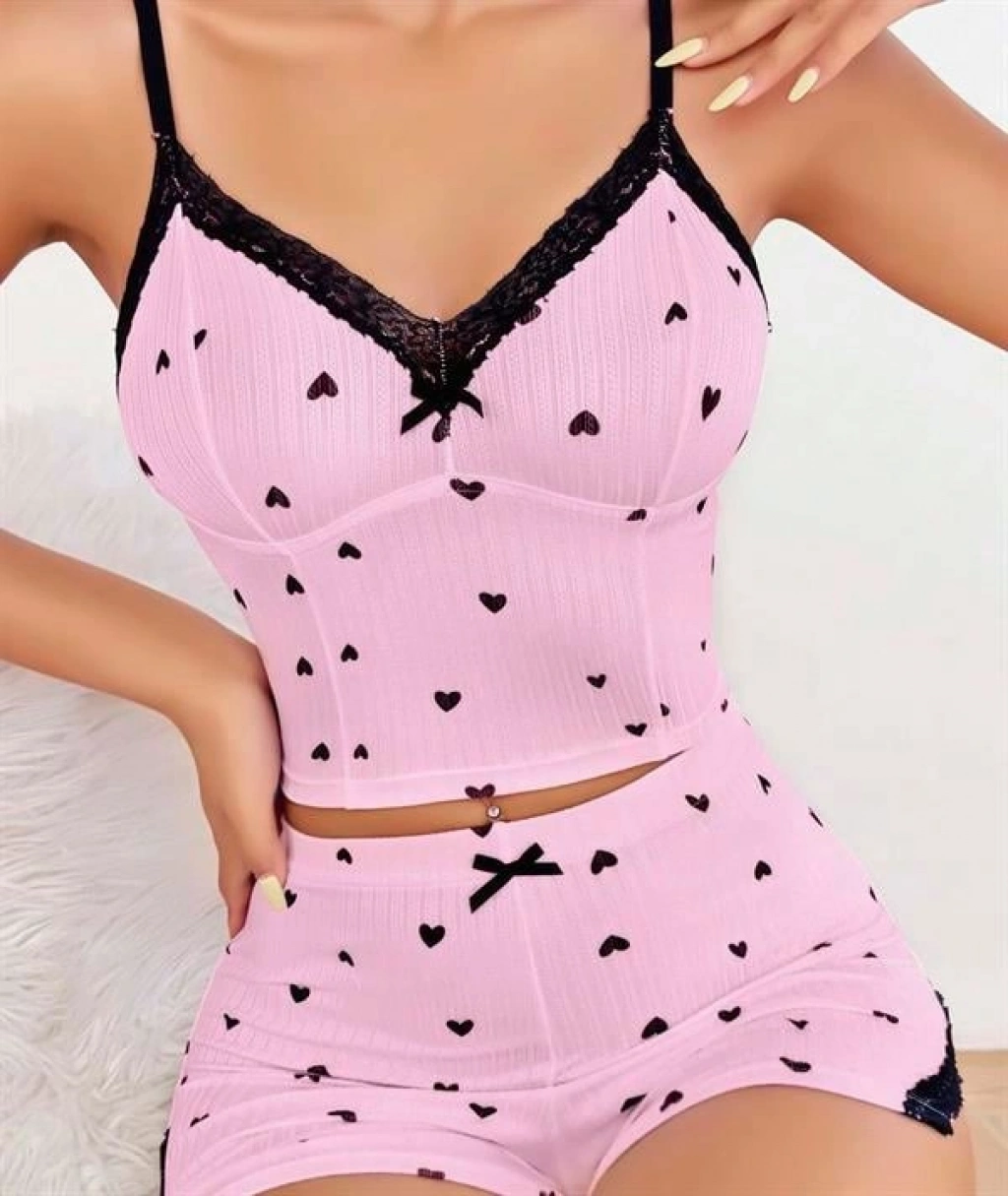 VipMarketim Pembe Kalp Desenli Askılı Şortlu Pijama Takım