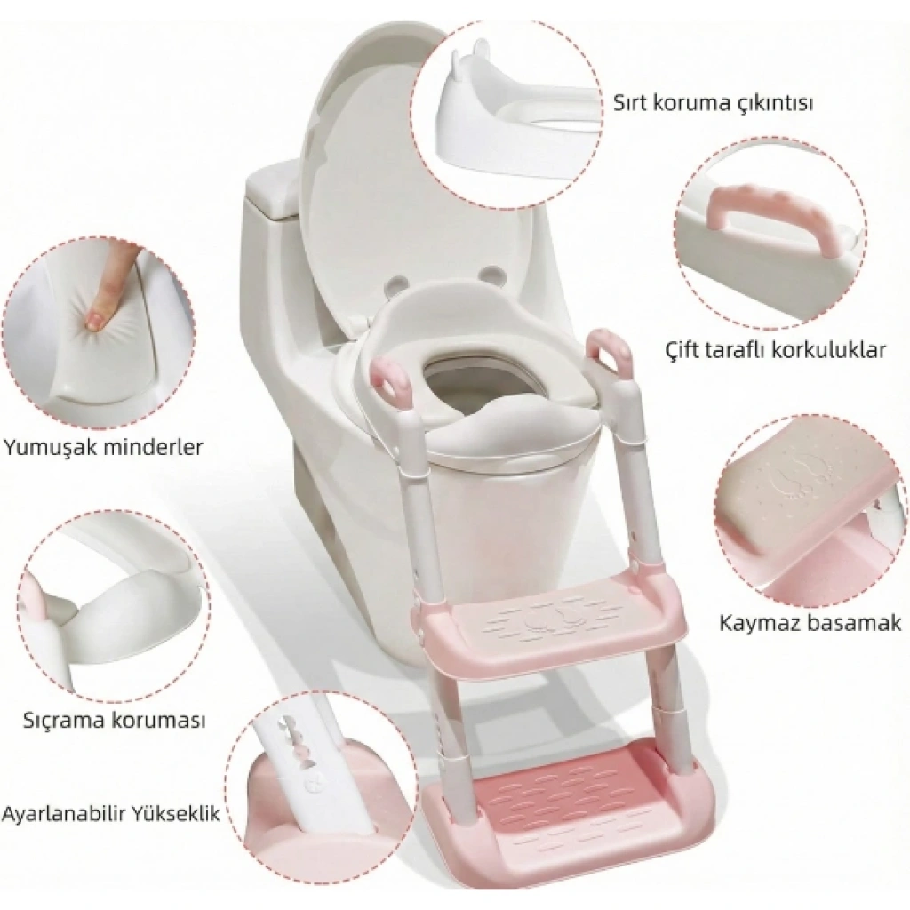Pembe merdivenli çocuk klozet tuvalet eğitimi aparatı, çocukların tuvalet alışkanlığını güvenli ve rahat bir şekilde kazanmasına yardımcı olmak için tasarlanmıştır. Çoğu standart klozet ile uyumlu yapısı sayesinde evde pratik kullanım sunar. Kaymaz basamakları ve ergonomik tutma kulpları, çocuğun klozete rahatça çıkıp inmesini sağlarken dengeyi artırır. Sıçrama önleyici oturma alanı hijyenik kullanım sağlar ve çıkarılabilir haznesi temizlik kolaylığı sunar. Ayarlanabilir merdiven yüksekliği sayesinde farklı yaş ve boydaki çocuklara uyum sağlar. Dayanıklı plastik malzemeden üretilmiş olup sağlam yapısı ile uzun süreli kullanım için uygundur. Katlanabilir tasarımı sayesinde kullanılmadığı zamanlarda yer kaplamadan saklanabilir. Paket İçeriği1 adet Pembe Merdivenli Çocuk Klozet Tuvalet Eğitimi Aparatı