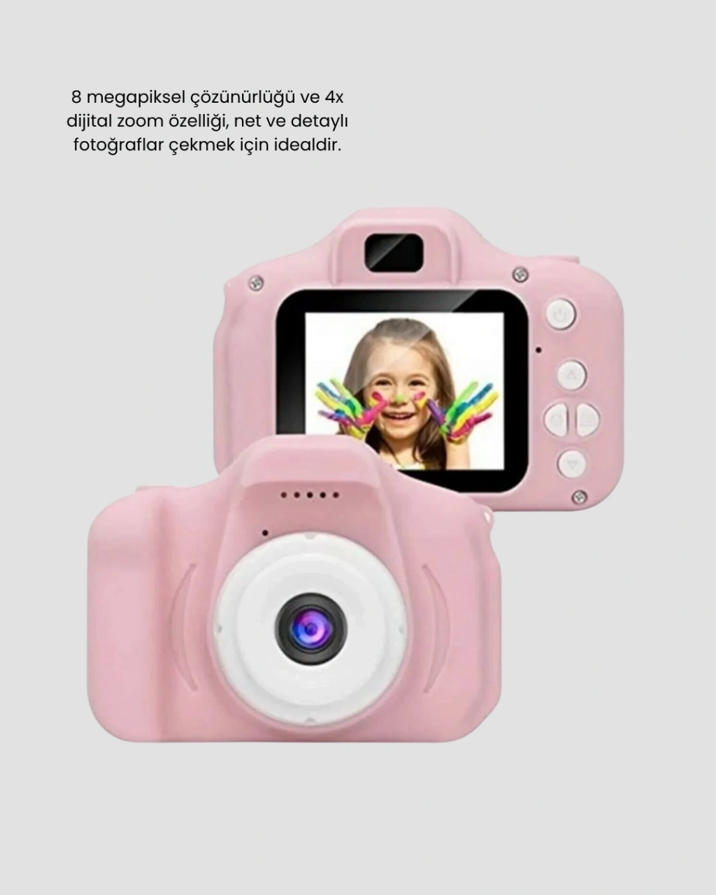 Pembe Mini 1080p HD Çocuk Kamera, çocukların eğlenerek fotoğraf çekmeyi öğrenmesi için tasarlanmış özel bir üründür. 8 megapiksel çözünürlüğü ve 4x dijital zoom özelliği sayesinde net, canlı ve detaylı fotoğraflar çekebilir. 2.0 inç TFT ekranı ile çekilen görüntüler anında görülebilir, böylece çocuklar kendi karelerini anında keşfeder.Çevre dostu, toksik olmayan malzemelerden üretilmiştir; ciltle temas ettiğinde alerjik reaksiyon oluşturmaz. Hafif ve dayanıklı tasarımı sayesinde çocukların ellerine rahatça sığar, düşmelere karşı dayanıklıdır. Komik çerçeveler, renkli filtreler ve sevimli çıkartmalar, çekim sürecini hem eğlenceli hem yaratıcı hale getirir.600 mAh bataryası uzun süre kesintisiz kullanım sağlar, USB kablo ile kolayca şarj edilebilir. 32GB’a kadar TF kart desteği ile binlerce fotoğraf saklama imkânı sunar. Doğum günleri veya özel günler için mükemmel bir hediye seçeneğidir.