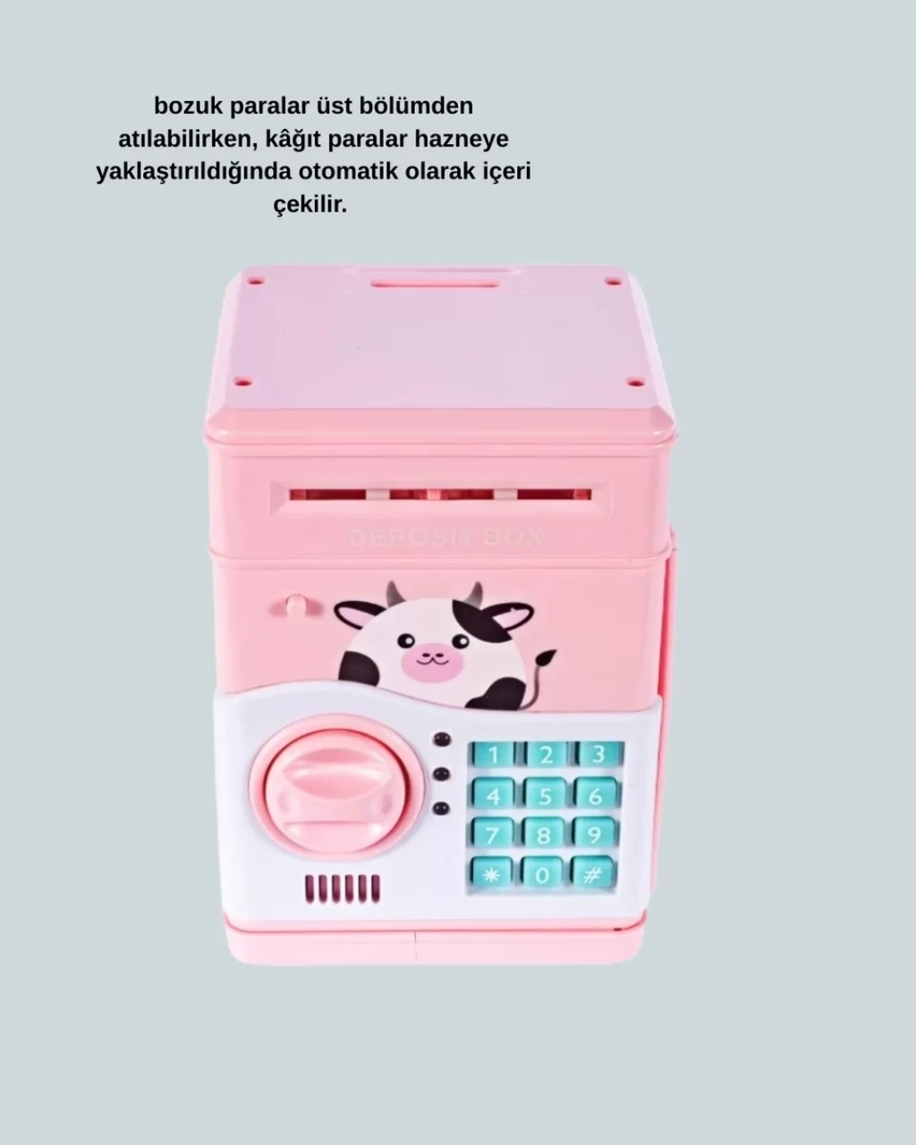ATM kasa görünümüne sahip bu pembe şifreli çocuk kumbarası, gerçekçi tasarımıyla çocukların ilgisini çeker. Otomatik para girişi, ışıklı ve sesli uyarılarla birleşerek eğlenceli bir kullanım sunar.Elektronik şifre sistemi, güvenli para saklama alışkanlığı kazandırır. Yüksek kapasiteli iç hacmi, uzun süreli birikim yapmaya olanak tanır. Dayanıklı ABS plastik gövdesi uzun ömürlüdür.
