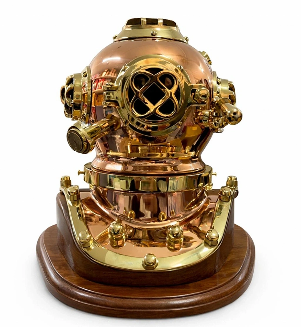 Mekanınıza tarihin en görkemli keşif ruhunu dahil edin! 50x50 cm boyutlarındaki bu devasa Pirinç Dalgıç Başlığı, denizlerin derinliklerindeki gizemi temsil eden en prestijli dekoratif objelerden biridir. Yüksek kaliteli masif pirinç ve bakır aksamların usta bir işçilikle birleştiği bu kask, antika "Mark V" modellerinden ilham alınarak aslına sadık bir replika olarak tasarlanmıştır. Altın sarısı pirincin parıltısı ile bakırın kızıl tonları, ağır ve vakur duruşuyla bulunduğu her ortamın atmosferini anında değiştirir. Masif ahşap tablası üzerine monte edilen bu kask; ızgaralı vizörleri, vidalı kilit mekanizmaları ve hava valfi detaylarıyla büyüleyici bir görsel derinlik sunar. Ofis lobileri, geniş salonlar, lüks kütüphaneler veya marin temalı restoranlar için eşsiz bir odak noktası olan bu dev boy dalgıç kaskı, koleksiyonerler ve deniz tutkunları için sunulabilecek en değerli ve lüks hediye alternatiflerinden biridir. Ürün Teknik Özellikleri ÖzellikAçıklama Ürün AdıDev Boy Pirinç Dalgıç Başlığı (Kaskı) Boyutlar50 cm (Yükseklik) x 50 cm (Genişlik) MalzemeYüksek Kaliteli Pirinç, Bakır ve Cam Detaylar TabanVernikli Masif Ahşap Tabla TasarımNostaljik Mark V Dalgıç Kaskı Replika StilGörkemli, Nostaljik, Marin ve Lüks Dekorasyon AğırlıkYüksek Malzeme Kalitesine Sahip Ağır Gövde Paket İçeriği1 Adet Masif Ahşap Tablalı Dev Boy Pirinç Dalgıç Başlığı (50x50 cm)