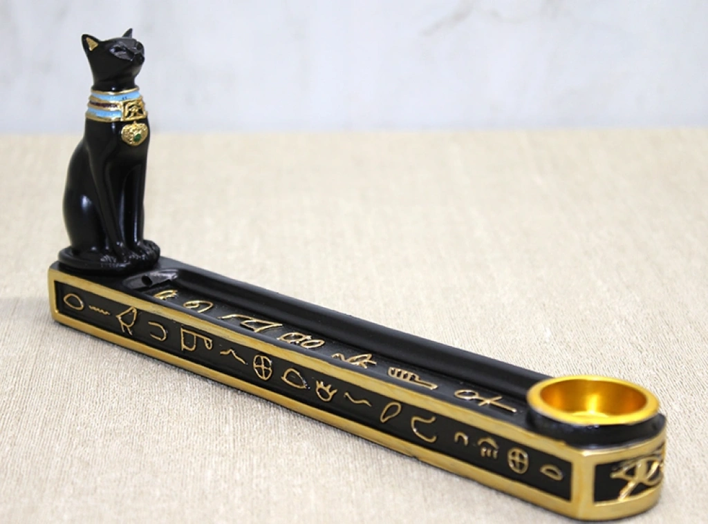 Polyester Mısır Kedisi Tütsülük, antik Mısır kültüründen ilham alınarak tasarlanmış dekoratif ve işlevsel bir tütsülük modelidir. 25 cm uzunluğundaki yapısı sayesinde tütsü çubuklarını güvenli ve düzenli bir şekilde kullanmayı sağlarken, üzerinde yer alan Mısır kedisi figürü ürüne mistik ve estetik bir hava katar. Siyah ve altın detayların birleşimi göz alıcı bir şıklık sunarken, polyester malzemeden üretilmiş olması ürüne sağlamlık, hafiflik ve uzun ömür kazandırır. Hem tütsü kullanımını kolaylaştıran hem de bulunduğu ortamın dekorasyonuna karakter katacak özel bir tasarımdır. Mısır temalı objeleri sevenler ve etkileyici dekoratif parçalar arayanlar için ideal bir seçimdir.Paket İçeriği1 adet Polyester Mısır Kedisi Tütsülük
