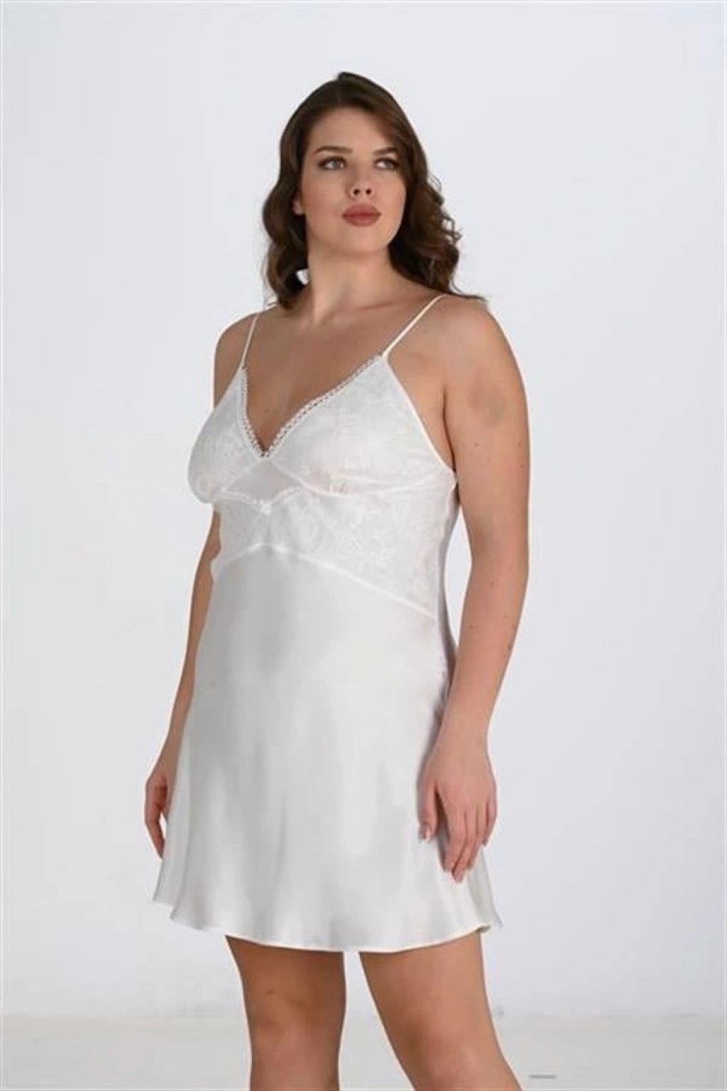 Vipmarketim Premium Büyük Beden Saten Dantel İşlemeli Ekru 2'li Gecelik Sabahlık Takımı Bigsize