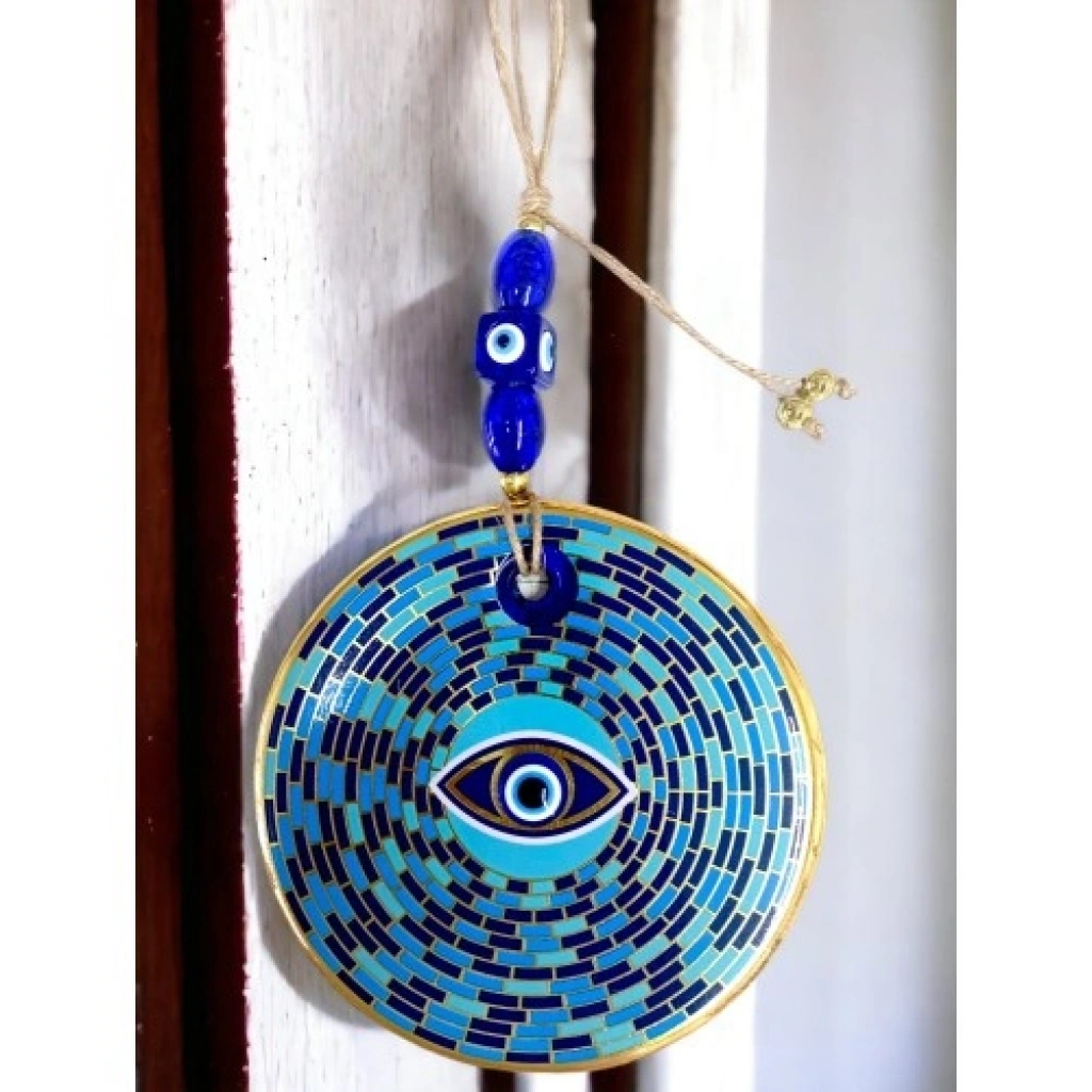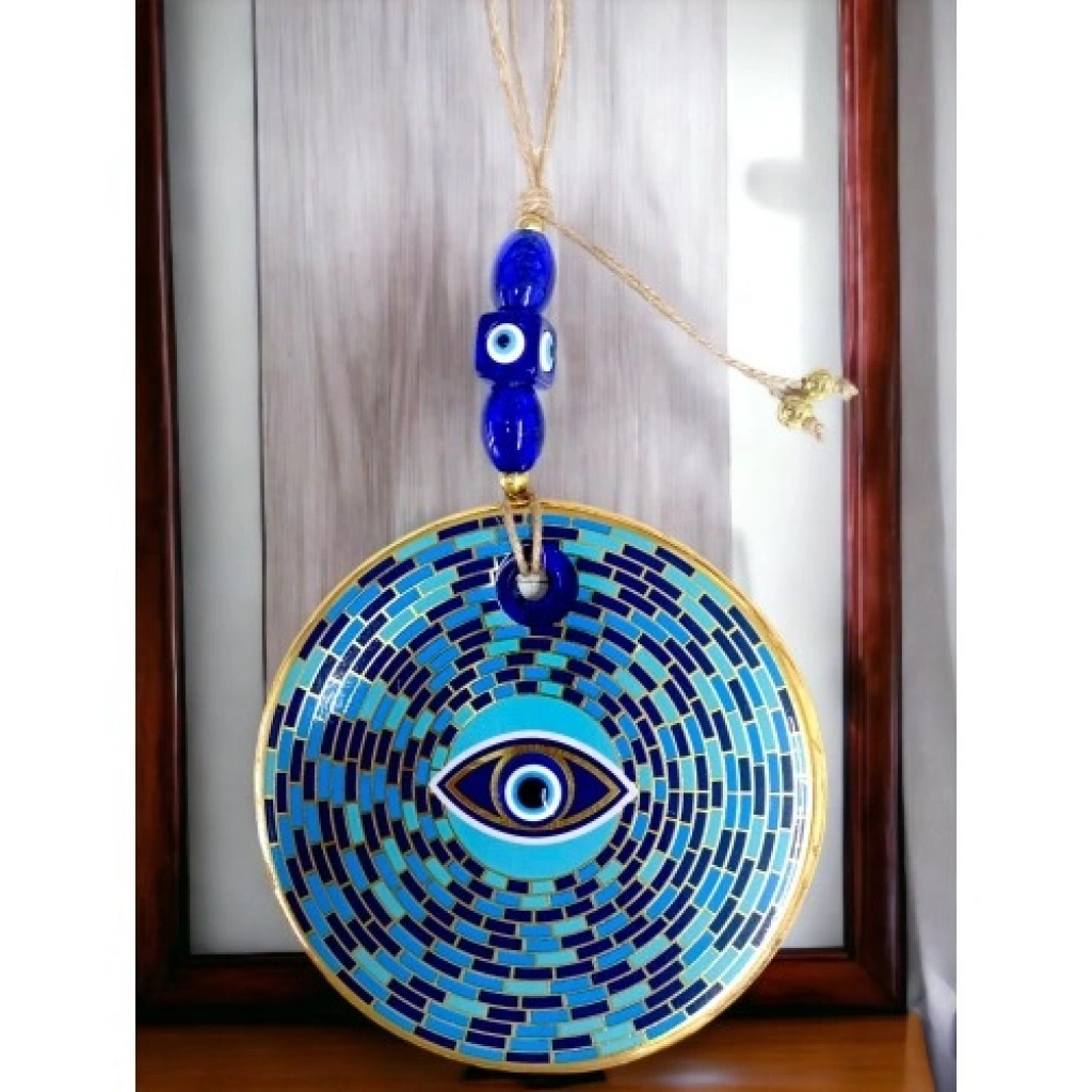 El yapımı cam duvar süsü Mavi cam nazar boncuğundan üretilmiştir Göz formunda, prizma desenlidir Duvar dekoru ve nazarlık olarak kullanılabilir Ürün Ölçüleri Cam kısmı çapı: 13 cm Toplam uzunluk (ip dahil): Yaklaşık 30 cm