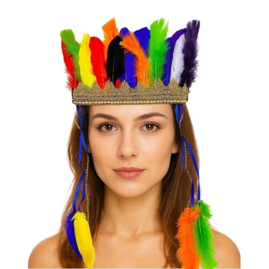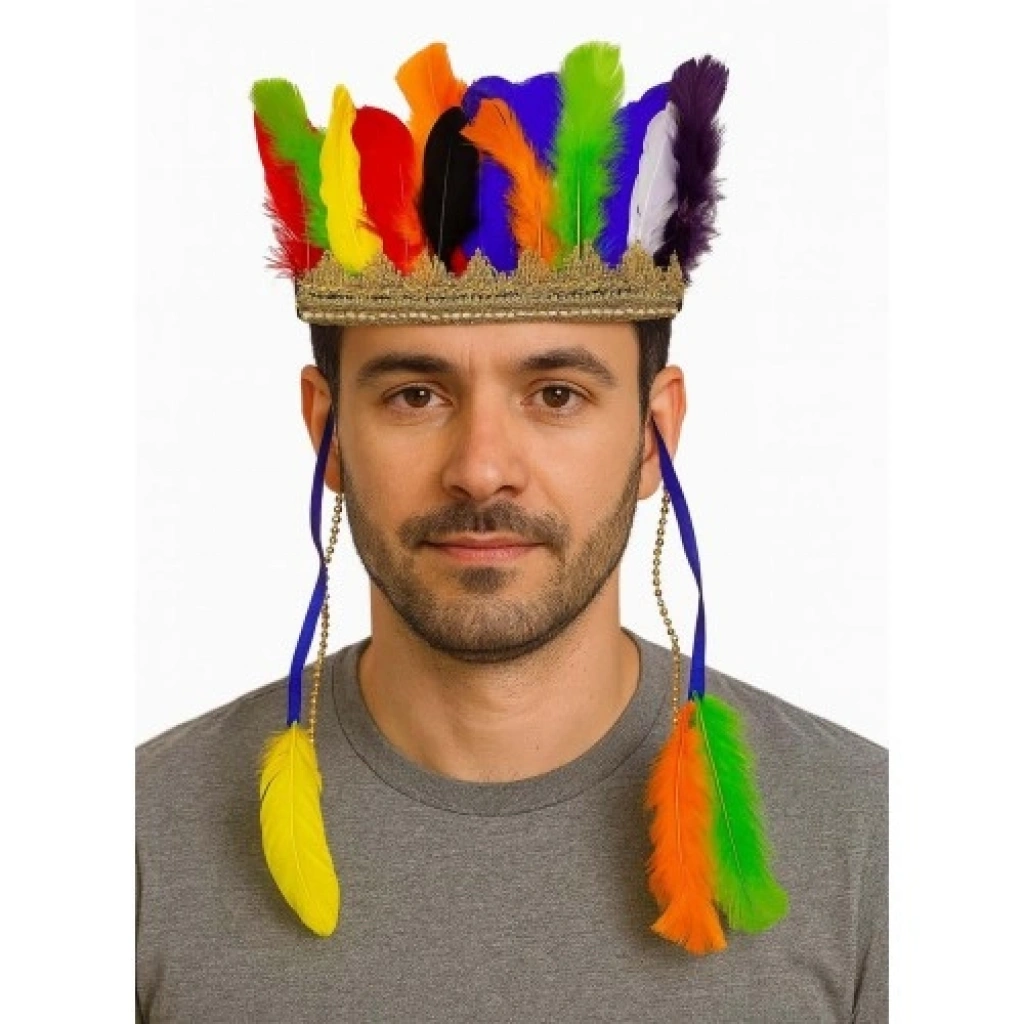 ve AvantajlarıGörsel Şölen Sunan Tüyler: Kırmızı, mavi, sarı ve yeşil gibi doğanın tüm renklerini barındıran gerçek tüy detayları, her açıda etkileyici bir görünüm sergiler.Esnek Lastikli Yapı: Arka kısmında bulunan kaliteli lastik sistemi sayesinde hem çocukların hem de yetişkinlerin kafa yapısına mükemmel uyum sağlar; kayma yapmaz ve konforludur.Geleneksel İşlemeler ve Boncuklar: Başlığın alın kısmında yer alan özel el işçiliği motifler ve boncuk süslemeleri, geleneksel Kızılderili sanatını modern bir dokunuşla yansıtır.Hafif ve Dayanıklı: Heybetli görünümüne rağmen oldukça hafiftir; uzun süreli festivallerde ve çekimlerde başınızı yormaz.Kültürel Sembolizm: Her bir tüyün başarıyı ve doğaya saygıyı temsil ettiği bu tasarım, takan kişiye özgün ve güçlü bir duruş kazandırır.Kullanım AlanlarıTemalı Kostüm Partileri: "Vahşi Batı" veya "Kabile" konseptli partilerin en görkemli ve en dikkat çekici parçasıdır.Festival ve Karnavallar: Açık hava etkinliklerinde, konserlerde ve kültürel festivallerde özgür ruhunuzu yansıtmak için idealdir.Sanatsal Fotoğraf Çekimleri: Portre çekimlerinde, moda projelerinde veya otantik konseptli video çekimlerinde dramatik bir derinlik yaratır.Etnik Dekorasyon: Kullanılmadığı zamanlarda evinizde veya ofisinizde kültürel bir dekoratif obje veya koleksiyon parçası olarak sergilenebilir.