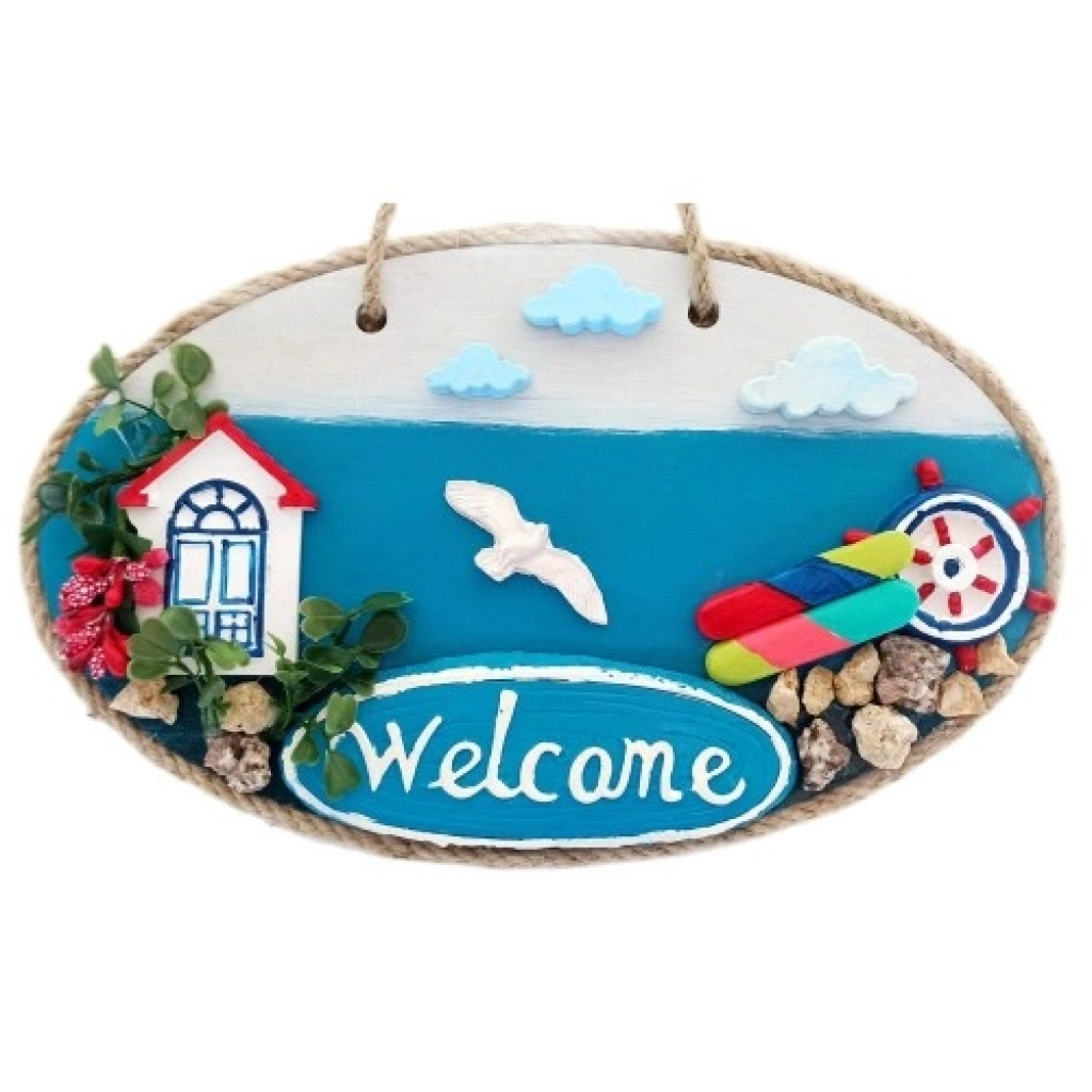 Sahil Kasabası Welcome Yazılı El Yapımı Kapı SüsüSahil, denizin huzurunu ve yaz kasabalarının sıcak atmosferini yansıtan tasarımıyla hazırlanan bu welcome yazılı kapı süsü, evinize ferah ve samimi bir karşılama sunar. Sahil kasabası teması; rahatlık, mutluluk ve tatil hissini kapı girişlerinize taşıyarak misafirlerinizi gülümseyerek karşılamanızı sağlar.Ürünümüz 3 mm kalınlığında MDF zemin üzerine üretilmektedir. Kapı süsümüzde yer alan tüm objeler el boyaması olup, ürün tamamen el işçiliğiyle özenle hazırlanmaktadır. İnce fırça darbeleriyle boyanan detaylar sayesinde her ürün kendine özgü bir karakter taşır ve benzersizdir.Sahil kasabası welcome kapı süsümüz 26 santimetre eninde ve 16 santimetre boyundadır. Dengeli ölçüleri sayesinde apartman kapısı, ev kapısı, yazlık ev girişi veya iç mekân dekoru olarak rahatlıkla kullanılabilir. Hafif yapısı sayesinde kolayca asılabilir.Yazlık ev dekorasyonu, deniz temalı tasarımlar ve sıcak karşılama detaylarını sevenler için ideal olan bu el yapımı kapı süsü; yeni ev hediyesi, yazlık ev hediyesi ve özel günler için şık ve anlamlı bir hediyelik alternatifi sunar.