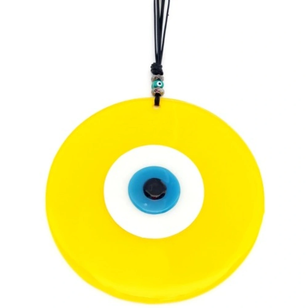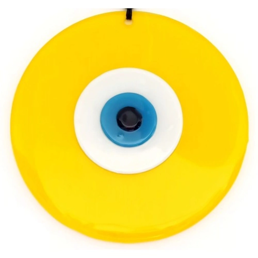 Sarı renk nazar boncuklu deri ipli ürünümüz tamamen el işçiliği ile üretilmiştir. Camı 8 mm kalınlığında olup birinci kalite cam kullanılmıştır. Duvar süsümüz 20 santimetre çapındadır. İp dahil 32 santimetre boyundadır.