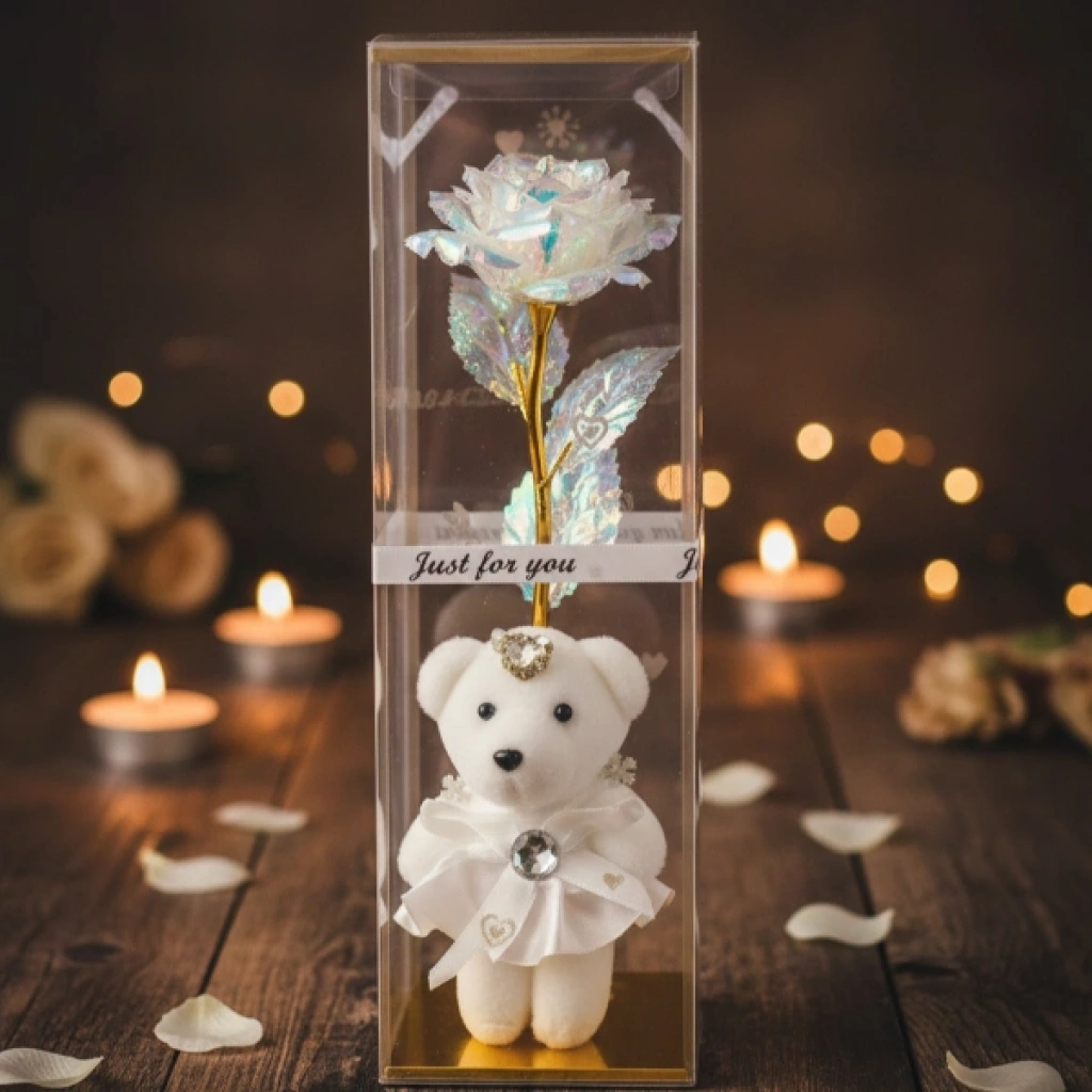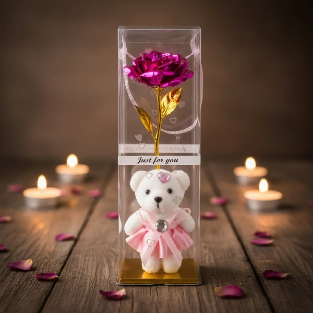 Şeffaf kutulu ayıcıklı sonsuzluk gülü, özel günlerde kalıcı ve anlamlı bir hediye sunmak isteyenler için tasarlanmış dekoratif bir aranjmandır. Şeffaf koruyucu kutu içerisinde yer alan metalik görünümlü gül ve sevimli ayıcık detayı, ürüne şık ve dikkat çekici bir görünüm kazandırır. Uzun saplı gül tasarımı ile klasik buket formunu modern bir sunumla birleştirir. İç kısmında bulunan ayıcık strafor malzemeden üretilmiştir ve dekoratif amaçlı kullanıma uygundur. Ayıcıklı sonsuzluk gülü tasarımı sayesinde sevgililer günü, doğum günü, yıl dönümü ve özel kutlamalarda tercih edilebilir. Masa, vitrin ve raf üzerinde sergilenebilen şeffaf kutulu dekoratif gül, uzun süre formunu koruyarak kalıcı bir hatıra niteliği taşır. Renk seçimi yapılamaz, ürün görseldeki renklerden biri karışık olarak gönderilir. Dekoratif hediye gülü hem romantik hem de estetik bir sunum arayanlar için ideal bir alternatiftir. Ürün Teknik Özellikleri Özellik Açıklama Ürün Adı Şeffaf Kutulu Ayıcıklı Sonsuzluk Gülü Malzeme Strafor ayıcık ve dekoratif gül Renk Görseldeki renklerden biri, karışık gönderim Kullanım Alanı Hediye ve dekoratif süs Paket İçeriği1 adet şeffaf kutulu ayıcıklı sonsuzluk gülü (renkler karışık gönderilir)