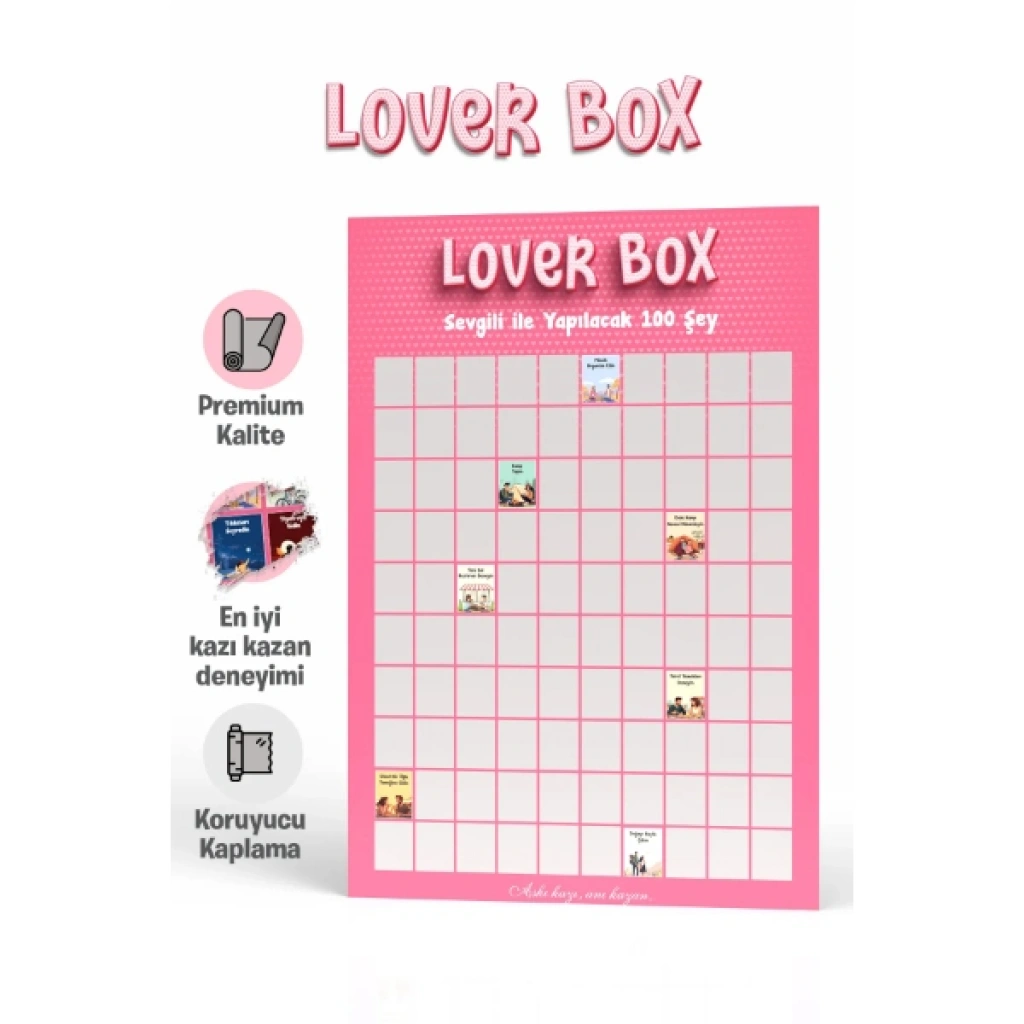 Sevgili ile Yapılacak 100 Şey Kazı Kazan Posteri, ilişkinize heyecan katmak ve birlikte unutulmaz anılar biriktirmek için tasarlanmış romantik bir rehberdir. "Aşkı kazı, anı kazan!" mottosuyla yola çıkan bu interaktif poster, çiftlerin birlikte deneyimleyebileceği en özel aktiviteleri tek bir tabloda sunar. Premium kalitede kağıt üzerine uygulanan özel koruyucu kaplama sayesinde, kazıma işlemi son derece pürüzsüzdür ve altındaki renkli illüstrasyonlar her zaman canlı kalır. Romantik akşam yemeklerinden macera dolu gezilere kadar 100 farklı görevi tamamladıkça gümüş katmanı kazıyabilir ve ilişkinizin gelişimini görsel bir şölene dönüştürebilirsiniz. Pembe tonlarındaki şık tasarımıyla yatak odanızın veya oturma odanızın duvarında estetik bir dekoratif tablo olarak yerini alacak olan bu poster, monotonluktan uzaklaşmak isteyen çiftler için mükemmel bir motivasyon kaynağıdır. Sevgililer Günü, yıl dönümü veya doğum günleri gibi özel anlarda sevdiğinize verebileceğiniz en anlamlı ve kalıcı hediyelik poster seçeneklerinden biridir. Ürün Teknik Özellikleri ÖzellikAçıklama Ürün AdıSevgili ile Yapılacak 100 Şey - Kazı Kazan Posteri (Lover Box) İçerikÇiftler İçin Hazırlanmış 100 Romantik ve Eğlenceli Görev MateryalPremium Kalite Mat Kuşe Kağıt KaplamaKoruyucu Özel Katman ve Kolay Kazınabilir Gümüş Yüzey TasarımLover Box Temalı, Pembe Romantik İllüstrasyonlar Fonksiyonİlişki Güçlendirici, Dekoratif ve İnteraktif Anı Listesi Hediye KonseptiSevgililer Günü, Yıl Dönümü, Yeni Ev Hediyesi Paket İçeriği1 Adet Sevgili ile Yapılacak 100 Şey Kazı Kazan Posteri