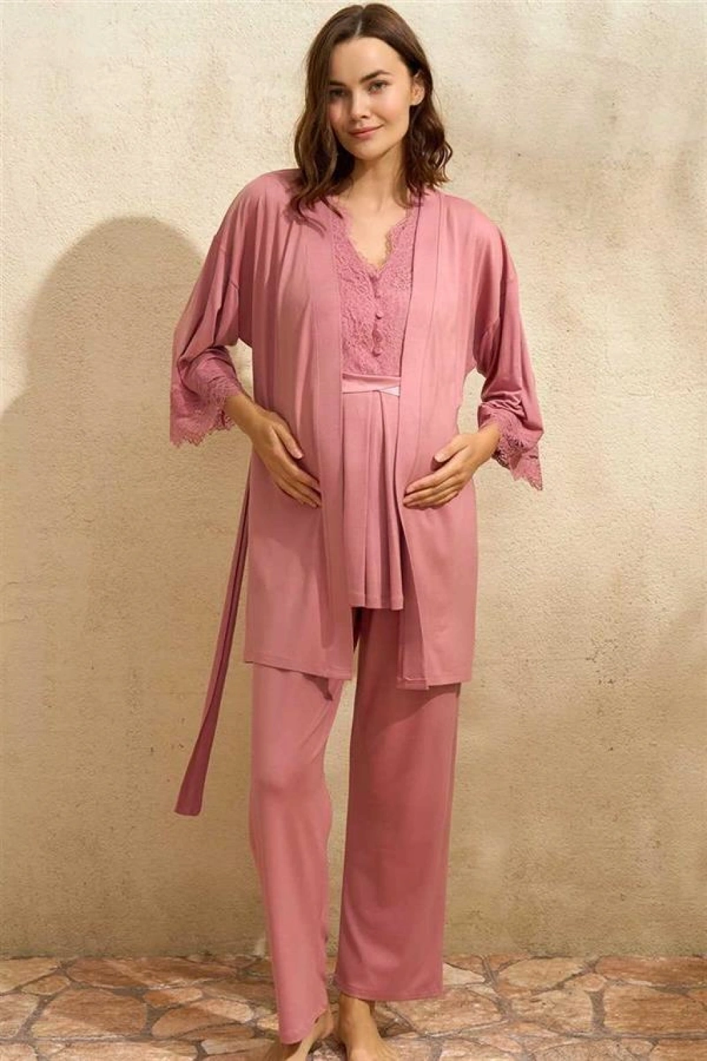 V yaka ve zarif dantel detayları feminen bir görünüm sunarken, uzun ve rahat kesimi büyüyen karna uyum sağlar. Yaz ayları için ideal olan bu takım, evde, hastane sürecinde ve lohusalık döneminde rahatlıkla kullanılabilir.