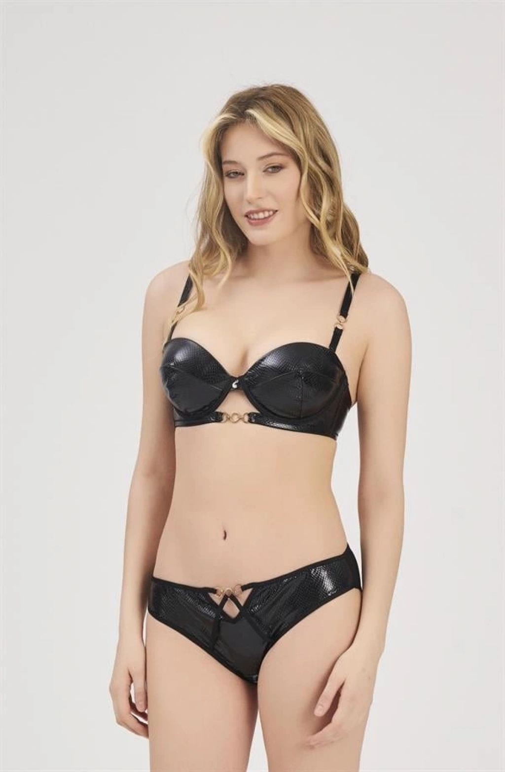 Cesur ve iddialı bir stil arayanlar için tasarlanan bu siyah deri sütyen külot takımı, güçlü duruşu ve feminen detaylarıyla dikkat çeker. Destekli sütyeni göğüsleri dik ve dolgun gösterirken, deri dokusu takıma çarpıcı ve baştan çıkarıcı bir hava katar.