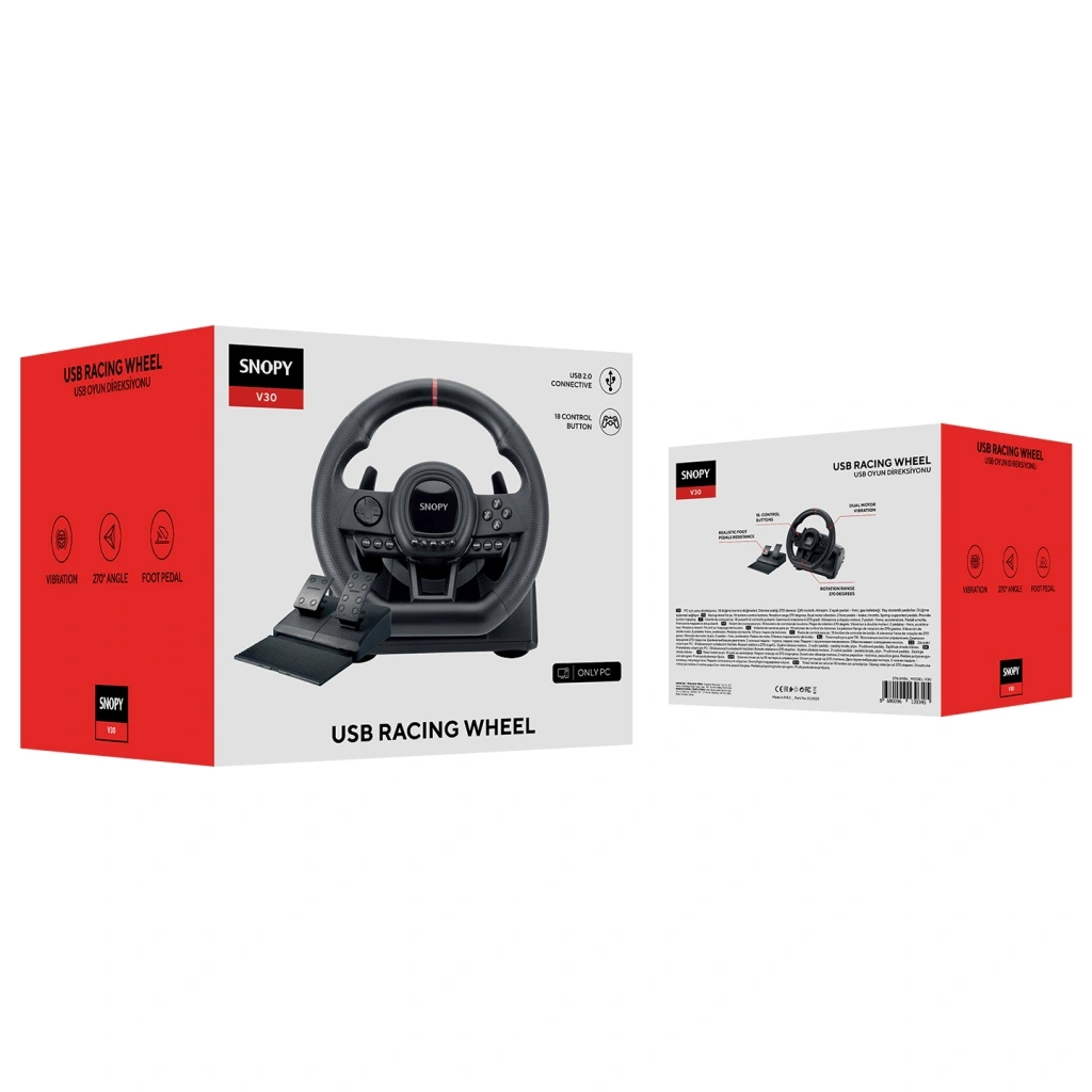 AçıklamaOyun Direksiyon SetiMarkaSnopyModelV30RenkSiyahUyumluPCDireksiyon Dönüş Derecesi 270 DereceKullanım TürüTak ve ÇalıştırMalzemePlastik, MetalArayüzUSB TipiTitreşimEvetMotor çalışma gücüDC5VMotor çalışma akımıUSB çalışma akımı 160mADüğme13 Düğme ve 8 Yönlü D-PadGaranti Süresi24 Ay