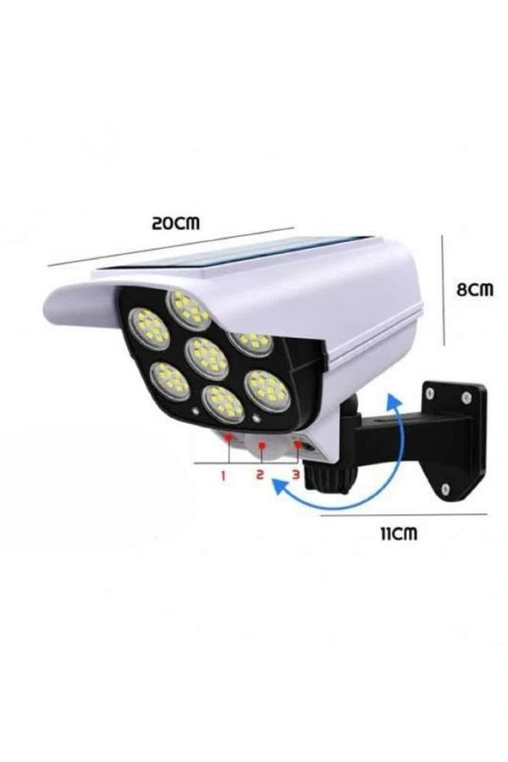 Bu güneş enerjili LED güvenlik lambası, modern tasarımı ve enerji verimliliği ile dış mekanlarınızda güvenliğinizi ve aydınlatmanızı artırmak için idealdir. Güneş paneli, gündüzleri enerji depolayarak gece harekete duyarlı sensör aracılığıyla devreye girer ve otomatik olarak güçlü ışık yayar. Hareket sensörü, 120° algılama açısıyla 5-8 metre mesafeye kadar hareketi tespit edebilir, bu da ışığın yalnızca ihtiyaç duyulduğunda açılmasını sağlar ve enerji tasarrufu sağlar.IP65 su geçirmez özelliği, bu lambayı tüm hava koşullarında kullanabileceğiniz anlamına gelir; yağmur, kar ve rüzgar gibi zorlu hava şartlarına karşı dayanıklıdır. Şık ve modern kamera tasarımı, sadece aydınlatma değil aynı zamanda çevre güvenliğinizi de sağlar. Kablolu bağlantı gerektirmeyen bu ürün, basit montajı ile her türlü dış mekan alanına kolayca kurulabilir. Kumanda ile açma, kapama ve mod değiştirme gibi işlemleri uzaktan gerçekleştirebilirsiniz. Bu dayanıklı ABS plastik ve alüminyum yapısına sahip aydınlatma, her türlü ortamda uzun süreli kullanım sağlar. Çevre dostu enerji tasarrufu sağlayan bu lamba, pratik ve güvenli bir aydınlatma çözümü arayanlar için mükemmel bir tercihtir.