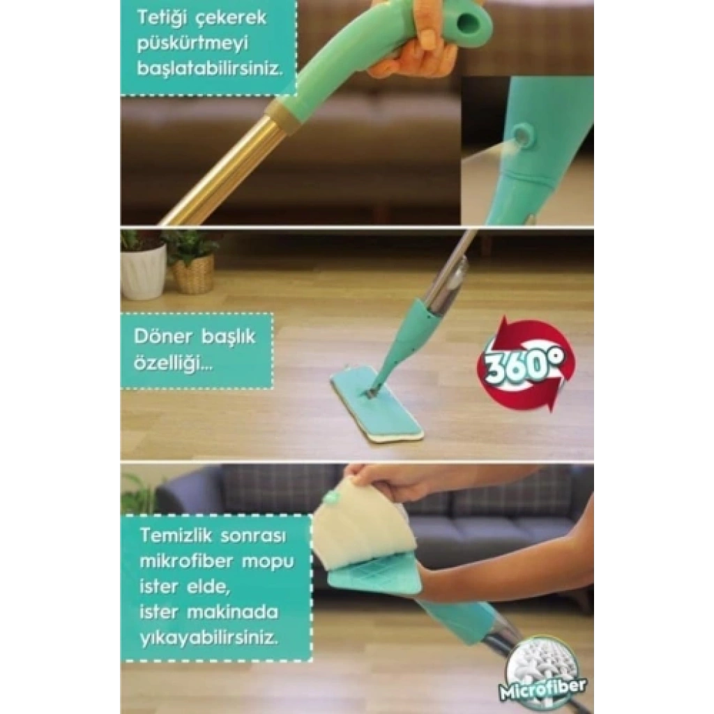 SPREY MOP PASPAS Mop Paspas, pratik, yer kaplamayan ve kovasız bir tasarıma sahiptir, böylece kullanımı son derece kolaydır. 4 adet yedek başlık hediyeli olarak sunulan bu ürün, montajı kolaydır ve haznesine su veya deterjan ekleyerek temizlik işlemlerini daha etkili hale getirebilirsiniz. 300 ml'lik haznesiyle uzun süreli kullanım sağlar. Microfiber başlıkları sayesinde her türlü yüzeyde etkili bir temizlik sağlar, ayrıca ergonomik tasarımıyla kullanıcıya konforlu bir deneyim sunar. Mutfak, banyo veya diğer yaşam alanlarında kullanım için idealdir.Gri renk.Mop Paspas, ev temizliğini kolaylaştıran ve pratik bir çözüm sunar. Microfiber başlıkları, her türlü zeminde etkili temizlik sağlarken, yer kaplamayan tasarımıyla depolama sorunu yaşamazsınız. 4 adet yedek başlıkla uzun süreli kullanım imkanı sunar. Ayrıca, haznesine su veya deterjan ekleyerek temizlik performansını artırabilirsiniz. Bu paspas, kullanıcı dostu özellikleriyle ev temizliğini keyifli hale getirirken, montajının kolaylığıyla da zamanınızdan tasarruf etmenizi sağlar.Paket İçeriği1 adet sprey mop paspas4 adet microfiber mop başlığı