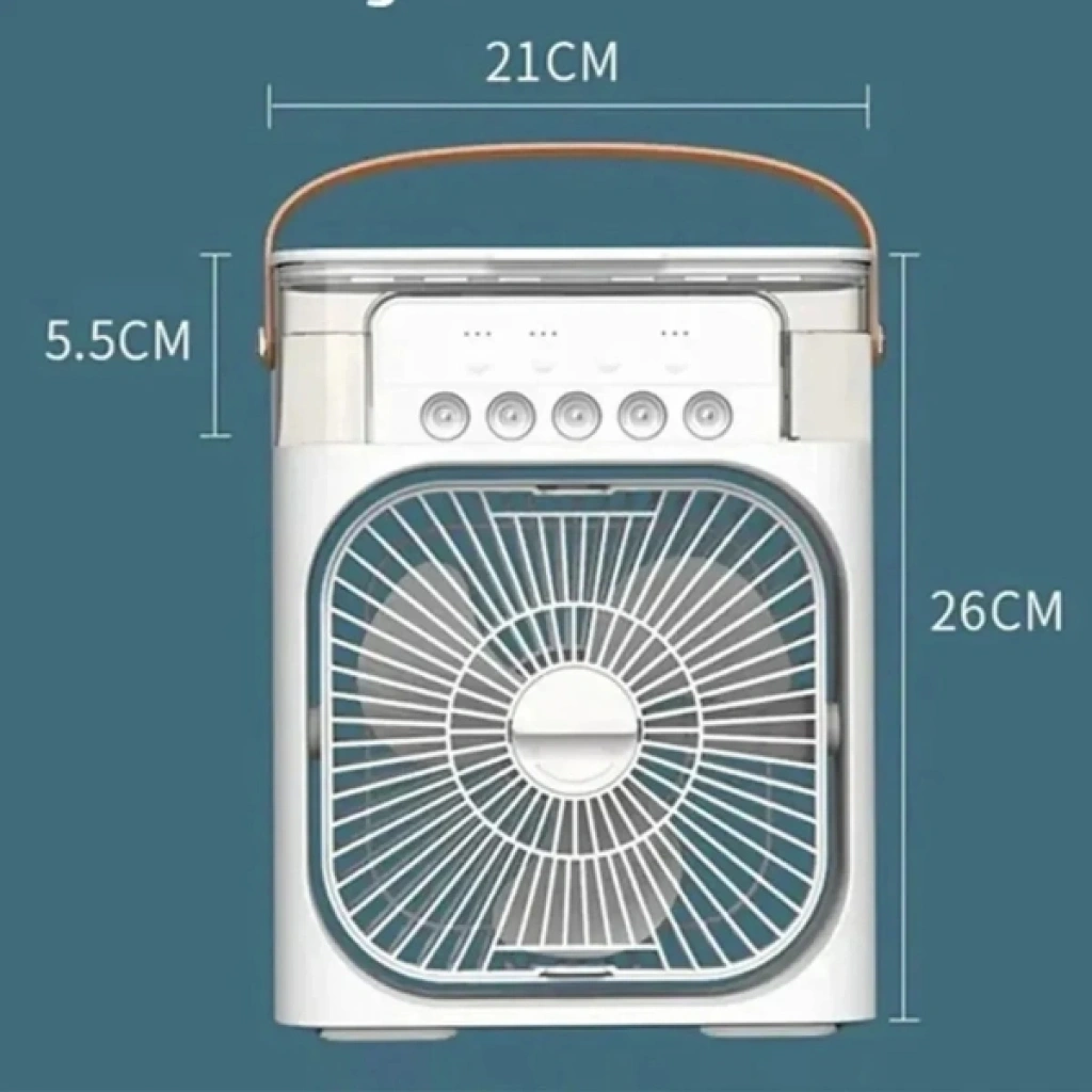 21 cm genişliğinde, 26 cm yüksekliğinde ve 5.5 cm derinliğinde olan su hazneli masa vantilatörü, hem serinletici hem de nemlendirici özelliğiyle yaz aylarında ferah bir ortam sunar. Üst kısmındaki 600 ml kapasiteli su haznesi musluk suyu ile doldurulabilir, istenirse buz da eklenerek daha serin bir etki elde edilebilir. Aynı anda 5 noktadan buhar püskürtme fonksiyonu ile geniş alanlarda etkili nemlendirme sağlar. 1 sprey ile 12 saat, 3 sprey ile 4 saat ve 5 sprey açıkken 2.5 saat kesintisiz çalışır. Taşıma sapı sayesinde kolayca taşınabilir. USB kablo ile çalışır ve farklı iç mekânlarda kullanıma uygundur. Klima gibi kuru hava yaratmaz, ortamın nem dengesini korur. Özellikle ev, ofis, yatak odası ve bebek odası gibi alanlarda tercih edilir. Paket İçeriği1 Adet Su Hazneli masa Vantilatörü