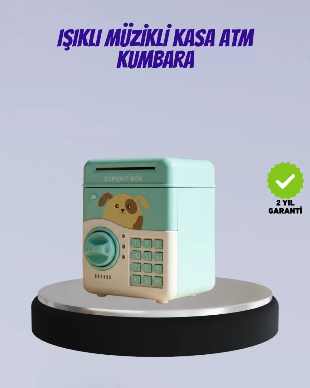 ATM kasa görünümüne sahip bu su yeşili şifreli kumbara, gerçekçi tasarımıyla çocukların ilgisini çeker. Otomatik para girişi ve ışıklı-sesli uyarılar, eğlenceli bir kullanım deneyimi sunar.Elektronik şifre sistemi, güvenli para saklama alışkanlığı kazandırır. Geniş iç hacmi, uzun süreli birikim yapmaya olanak tanır. Dayanıklı yapısı sayesinde uzun ömürlüdür.