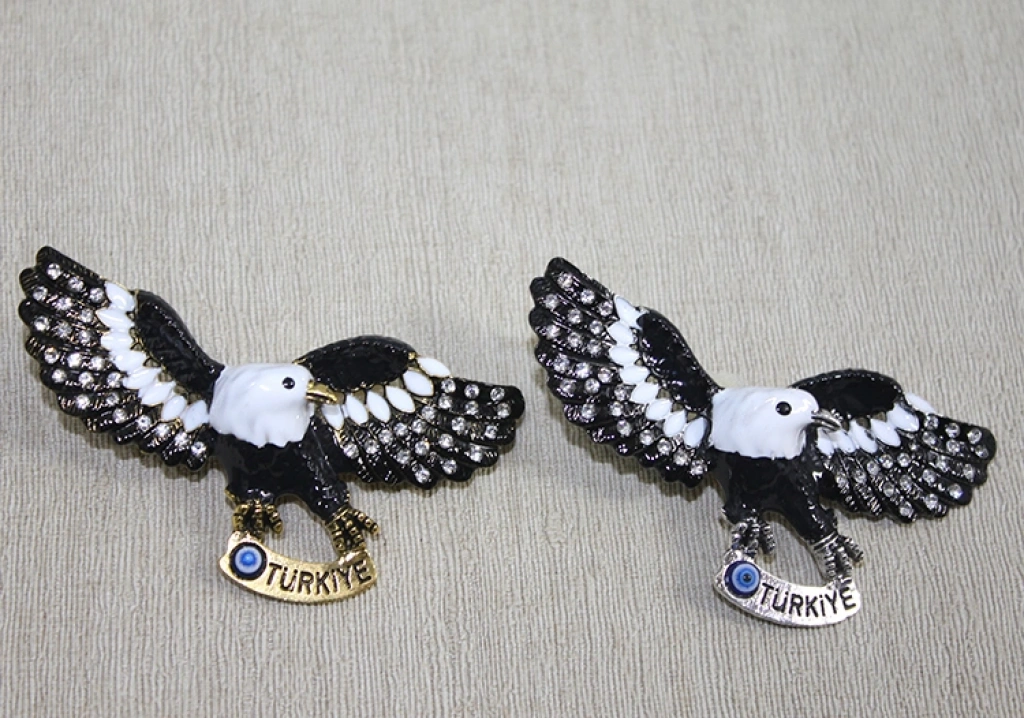 Swarovski Taşlı Kartal Figürlü Magnet, kanatları açık kartal tasarımı ve parlak taş detaylarıyla dikkat çeken dekoratif bir buzdolabı magnetidir. Kartal figürünün güçlü duruşu ve kanat formundaki detaylı işçilik ürüne estetik ve iddialı bir karakter kazandırır. Işıltılı yüzeyiyle öne çıkan Swarovski taşlı tasarım yapısı, klasik magnet modellerine göre daha dikkat çekici bir görünüm sunar. Metal görünümlü gövde üzerine yerleştirilen taş süslemeler ürüne zarif bir parlaklık kazandırırken, figür formu sayesinde bulunduğu yüzeyde belirgin bir dekoratif etki oluşturur. 6,5 cm boyutundaki kompakt yapısıyla buzdolabı ve metal yüzeylerde rahatlıkla kullanılabilir. Güç ve özgürlük sembolü olarak öne çıkan bu model, şık bir kartal figürlü dekoratif magnet alternatifi sunar ve aynı zamanda estetik bir taşlı buzdolabı magneti seçeneğidir. Ürün Teknik Özellikleri ÖzellikAçıklama Ürün AdıSwarovski Taşlı Kartal Figürlü Magnet Boyut6,5 cm TasarımKanatları Açık Kartal Figürü ve Taşlı Detay Kullanım AlanıBuzdolabı ve Metal Yüzeyler Paket İçeriği1 Adet Swarovski Taşlı Kartal Figürlü Magnet