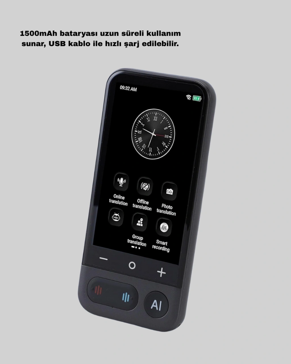 Yabancı diller artık engel değil!Bu taşınabilir sesli çeviri cihazı, dünya genelinde tam 139 dili çevrimiçi, 17 dili ise çevrimdışı olarak destekleyerek, uluslararası iletişimi kolaylaştırır.İş seyahatlerinde, yurt dışı tatillerinde veya eğitimde dil bariyerini ortadan kaldırmak için mükemmel bir çözümdür.4.0 inç IPS dokunmatik ekranı, kullanıcı dostu bir arayüz sunar.Metin, sesli konuşma, yüz yüze diyalog ve fotoğraf tanıma gibi birden fazla çeviri moduna sahiptir.Yalnızca bir tuşa basarak anında sesli çeviri yapabilir; karşı tarafla doğal bir konuşma akışı sürdürebilirsiniz.Yapay zekâ destekli ses tanıma sistemi, doğru ve hızlı çeviri yaparak iletişimi sorunsuz hale getirir.Ayrıca 1500mAh bataryası uzun süreli kullanım sağlar, USB kablo ile hızlı şarj edilebilir.Alüminyum alaşım gövdesi şık, sağlam ve çizilmelere karşı dayanıklıdır.Android ve iOS uyumluluğu sayesinde kolay bağlantı kurabilir, gerektiğinde telefon üzerinden veri güncellemelerini alabilirsiniz.Kompakt ve hafif tasarımıyla cebinizde veya çantanızda rahatça taşıyabilirsiniz.Gerçek zamanlı çeviri kabiliyetiyle, dünya artık parmaklarınızın ucunda!