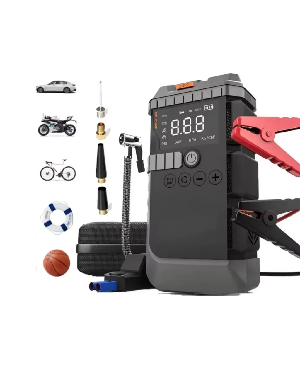 Araç sahipleri için tasarlanmış bu çok fonksiyonlu taşınabilir güç cihazı, yolda karşılaşabileceğiniz birçok soruna pratik çözümler sunar. Araç aküsü bitmesi, lastik basıncının düşmesi veya acil aydınlatma ihtiyacı gibi durumlarda kullanabileceğiniz bu cihaz, kompakt tasarımı sayesinde kolay taşınabilir ve araç bagajında minimum yer kaplar. Özellikle uzun yolculuklarda, kamp aktivitelerinde ve günlük araç kullanımında güvenli bir yardımcı olarak öne çıkar.Cihazın en önemli özelliklerinden biri güçlü akü takviye fonksiyonudur. Araç aküsü zayıfladığında veya tamamen boşaldığında, bu taşınabilir güç ünitesi sayesinde aracı hızlı ve güvenli şekilde çalıştırabilirsiniz. Akıllı koruma sistemi, ters bağlantı, kısa devre ve aşırı akım gibi riskleri minimize ederek güvenli kullanım sağlar. Bu sayede teknik bilgiye sahip olmayan kullanıcılar bile cihazı rahatlıkla kullanabilir.Ürünün bir diğer önemli özelliği entegre hava kompresörüdür. Dijital basınç göstergesi sayesinde lastik basıncını kolayca kontrol edebilir ve ihtiyacınıza göre ayarlayabilirsiniz. Araç lastikleri dışında motosiklet, bisiklet, scooter ve spor topları gibi farklı ürünleri şişirmek için de kullanılabilir. Çoklu başlık seçenekleri sayesinde geniş kullanım alanı sunar.Ayrıca cihaz güçlü bir powerbank özelliğine sahiptir. USB çıkış portları sayesinde telefon, tablet ve diğer elektronik cihazları kolaylıkla şarj edebilirsiniz. Yolculuk sırasında telefonunuzun şarjının bitmesi gibi durumlarda oldukça kullanışlıdır.LED aydınlatma sistemi ise karanlık ortamlarda ekstra güvenlik sağlar. Gece araç tamiri, kamp ortamı veya acil durumlarda güçlü LED ışık ile çevrenizi rahatlıkla aydınlatabilirsiniz. SOS modu ise acil durumlarda dikkat çekmek için kullanılabilir.Taşınabilir tasarımı, güçlü performansı ve çok yönlü kullanım özellikleri ile bu cihaz araç sahipleri için vazgeçilmez bir acil durum ekipmanı haline gelir. Bagajınızda bulundurabileceğiniz bu pratik cihaz, güvenli ve konforlu yolculuklar için ideal bir yardımcıdır.