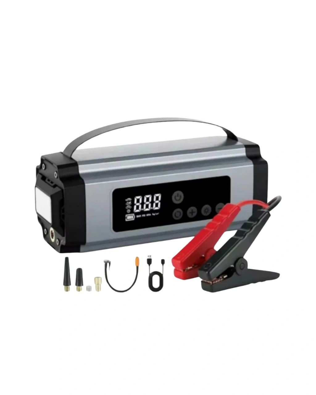 Yolculuk sırasında yaşanabilecek beklenmedik durumlara karşı hazırlıklı olmak, hem güvenliğiniz hem de konforunuz için büyük önem taşır. Bu çok fonksiyonlu taşınabilir cihaz; akü takviyesi, hava kompresörü, powerbank ve LED aydınlatma özelliklerini tek gövdede birleştirerek sürücüler için gerçek bir yol arkadaşı haline gelir. Kompakt ve ergonomik tasarımı sayesinde araç bagajında, torpido gözünde veya seyahat çantasında rahatlıkla taşınabilir.Akünüz bittiğinde başka bir araca veya yardıma ihtiyaç duymadan aracınızı tekrar çalıştırmanıza yardımcı olur. Güçlü akü takviye özelliği sayesinde soğuk hava koşullarında, uzun süre park halinde kalan araçlarda veya ani akü problemlerinde pratik bir çözüm sunar. Dijital ekranlı hava kompresörü ise lastik basıncını hassas şekilde ayarlamanıza imkân tanır. İstediğiniz basınç değerini girerek otomatik şişirme özelliğinden faydalanabilir, lastiklerinizin ideal seviyeye gelmesini kolayca sağlayabilirsiniz.Dahili yüksek kapasiteli bataryası sayesinde bu cihaz yalnızca araçlar için değil, günlük yaşamda da kullanışlıdır. Telefon, tablet ve USB ile şarj edilebilen diğer cihazlar için güvenilir bir powerbank görevi görür. Uzun yolculuklarda, kamp alanlarında veya elektrik erişiminin olmadığı durumlarda iletişimde kalmanıza yardımcı olur.Entegre LED ışık özelliği, karanlık ortamlarda lastik şişirme veya akü takviyesi yaparken görüş alanınızı aydınlatır. Aynı zamanda acil durumlarda fener olarak kullanılabilir. Modern Type-C şarj girişi sayesinde cihazın kendisi de hızlı ve pratik şekilde şarj edilebilir. Otomobil, motosiklet, bisiklet, spor topları ve şişme ürünler için çok yönlü kullanım sunan bu cihaz, araçta bulunması gereken temel ekipmanlardan biridir.