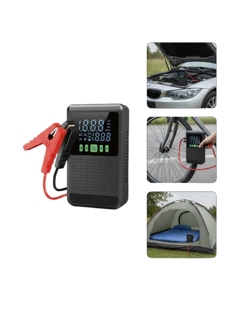 Bu şarjlı araç akü takviye ve hava kompresörü, sürüş güvenliğini artırmak amacıyla tasarlanmış çok fonksiyonlu bir cihazdır. Akü takviyesi, lastik şişirme, mobil şarj ve aydınlatma ihtiyaçlarını tek ürünle karşılar. Taşınabilir yapısı sayesinde hem şehir içi kullanımda hem de uzun yolculuklarda rahatlık sağlar.Güçlü takviye kapasitesi, aküsü zayıflamış araçların kısa sürede yeniden çalıştırılmasına yardımcı olur. Akıllı koruma sistemi, bağlantı hatalarına karşı güvenli kullanım sunar. Bu sayede kullanıcı, cihazı gönül rahatlığıyla kullanabilir.150 PSI’ye kadar destek sunan dijital hava kompresörü, lastik basıncını hassas şekilde ayarlamayı mümkün kılar. LCD ekran, anlık basınç değerlerini net şekilde gösterir. Otomatik durma özelliği, lastiklerin zarar görmesini önler.LED aydınlatma ve SOS modu, özellikle gece ve düşük görüş koşullarında büyük avantaj sağlar. Powerbank özelliği sayesinde mobil cihazlarınızı şarj edebilir, iletişimde kalabilirsiniz. Araçta bulunması gereken temel güvenlik ekipmanlarından biridir.
