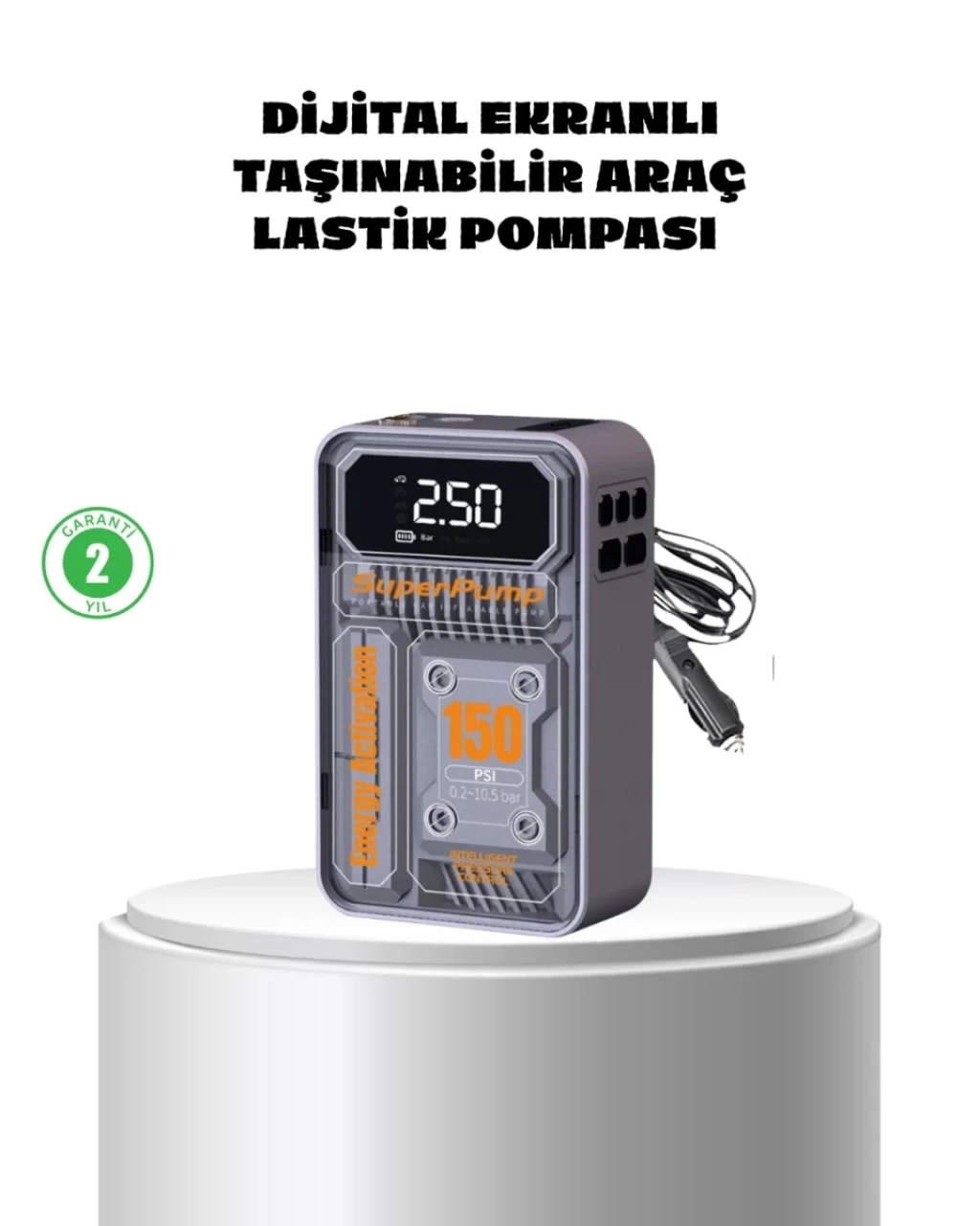 Bu taşınabilir kablosuz hava pompası, 150 PSI basınç gücüyle otomobil, motosiklet, bisiklet ve top gibi farklı ekipmanları kolayca şişirebileceğiniz çok yönlü bir cihazdır. Kompakt yapısı (82x45x134 mm) sayesinde torpido gözüne, çantanıza veya araç kol dayama kutusuna rahatlıkla sığar.Güçlü 60W motoru ve 30000 RPM hızıyla otomobil lastiğini 8-10 dakika içinde 0’dan 30 PSI seviyesine kadar şişirebilir. Tam şarj edildiğinde 6000mAh bataryası ile 4 lastiğe kadar kullanım sağlar.Üzerindeki LED ekran, basınç seviyesini anlık olarak gösterir. Dilerseniz hedef basıncı önceden ayarlayabilir ve pompa otomatik olarak durduğunda güvenli bir şekilde işlem tamamlanır.Otomatik kapanma özelliği fazla şişirmeyi önler. Kablosuz kullanımı sayesinde hareket özgürlüğü sağlar; elektrik bağlantısı aramanıza gerek kalmadan her yerde kullanabilirsiniz.Araç sahipleri, bisiklet sürücüleri ve spor tutkunları için ideal bir acil durum çözümüdür.