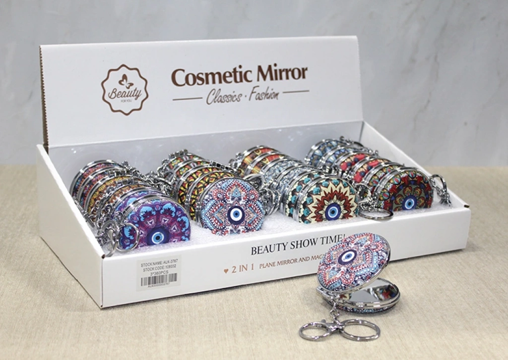Taşlı el aynası anahtarlık model 2, yuvarlak model ve nazar boncuğu baskılı renkli tasarımı ile şık ve dekoratif bir aksesuardır. Göz alıcı taş detayları ve renkli nazar boncuğu baskısı, aynayı estetik bir şekilde süsler ve hem işlevsel hem de dekoratif hale getirir. Anahtarlık özelliği sayesinde, kolayca taşınabilir ve her zaman yanınızda taşımanız için uygundur. Kompakt boyutu ile çanta, cüzdan veya anahtar gibi aksesuarlarınızda rahatça taşıyabileceğiniz bu anahtarlık, hem günlük kullanım hem de hediye olarak mükemmel bir seçimdir.Paket İçeriği1 adet Taşlı El Aynası Anahtarlık Model 2