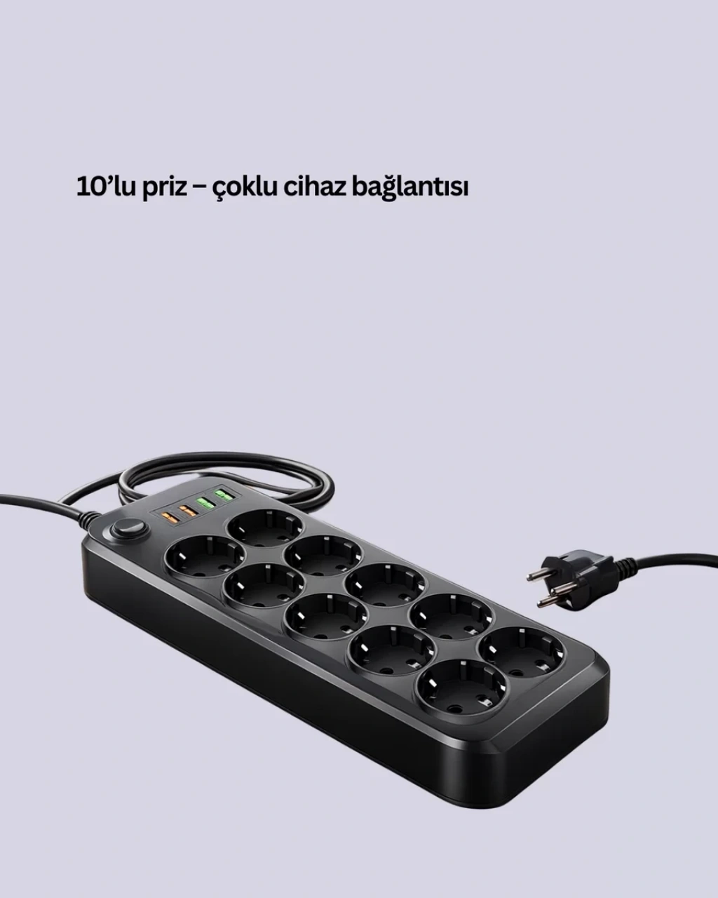 10 çıkışlı USB & Type-C destekli Termal Akım Korumalı Grup Priz, özellikle çoklu cihaz kullanılan alanlarda yüksek performans ve güvenlik sağlayarak enerji yönetimini en üst düzeye çıkarır. 10 adet priz yuvası sayesinde bilgisayar, monitör, yazıcı, modem, televizyon, ses sistemi, şarj cihazları ve çeşitli küçük ev aletlerinin aynı anda güç almasına imkân tanır. Bu sayede kablo kalabalığını azaltır ve çalışma alanını daha düzenli hale getirir.Termal koruma özelliği, ürünün en kritik teknolojilerinden biridir. Bu özellik priz aşırı ısındığında devreyi kapatarak olası elektriksel riskleri engeller. Böylece uzun süreli veya yüksek güç tüketimli kullanımda güvenliğiniz en üst seviyede tutulur. Aynı zamanda 10A akım koruma sistemi voltaj dalgalanmalarını dengeleyerek elektronik cihazların zarar görmesini önler.USB ve Type-C 2.1A portlar, mobil cihazların hızlı şarj edilmesini kolaylaştırır. Telefon ve tabletler için ayrı adaptör taşımak zorunda kalmadan doğrudan priz üzerinden şarj imkânı sunar. Özellikle ofis ortamlarında birden fazla cihazın aynı anda şarj edilmesi gereken durumlarda büyük konfor sağlar.2 metrelik kablo uzunluğu, priz kullanımını esnek hale getirir. Uzak noktadaki cihazlara rahatça güç sağlayabilir ve kullanım alanının ergonomisini bozmadan yerleşim yapabilirsiniz. Sağlam kablo yapısı, uzun ömürlü kullanım için tasarlanmıştır.Ürün, hem ev hem ofis hem de teknik çalışma alanlarında çok yönlü kullanım sunar. Modem, router, bilgisayar kasası, yazıcı, TV, şarj istasyonları gibi birçok farklı cihaz ile uyumlu olması onu her ortamda kullanılabilir hale getirir.Dayanıklı malzemesi ve modern tasarımıyla uzun yıllar güvenle kullanabileceğiniz bu grup priz, çoklu enerji ihtiyacı olan herkes için ideal bir çözümdür.
